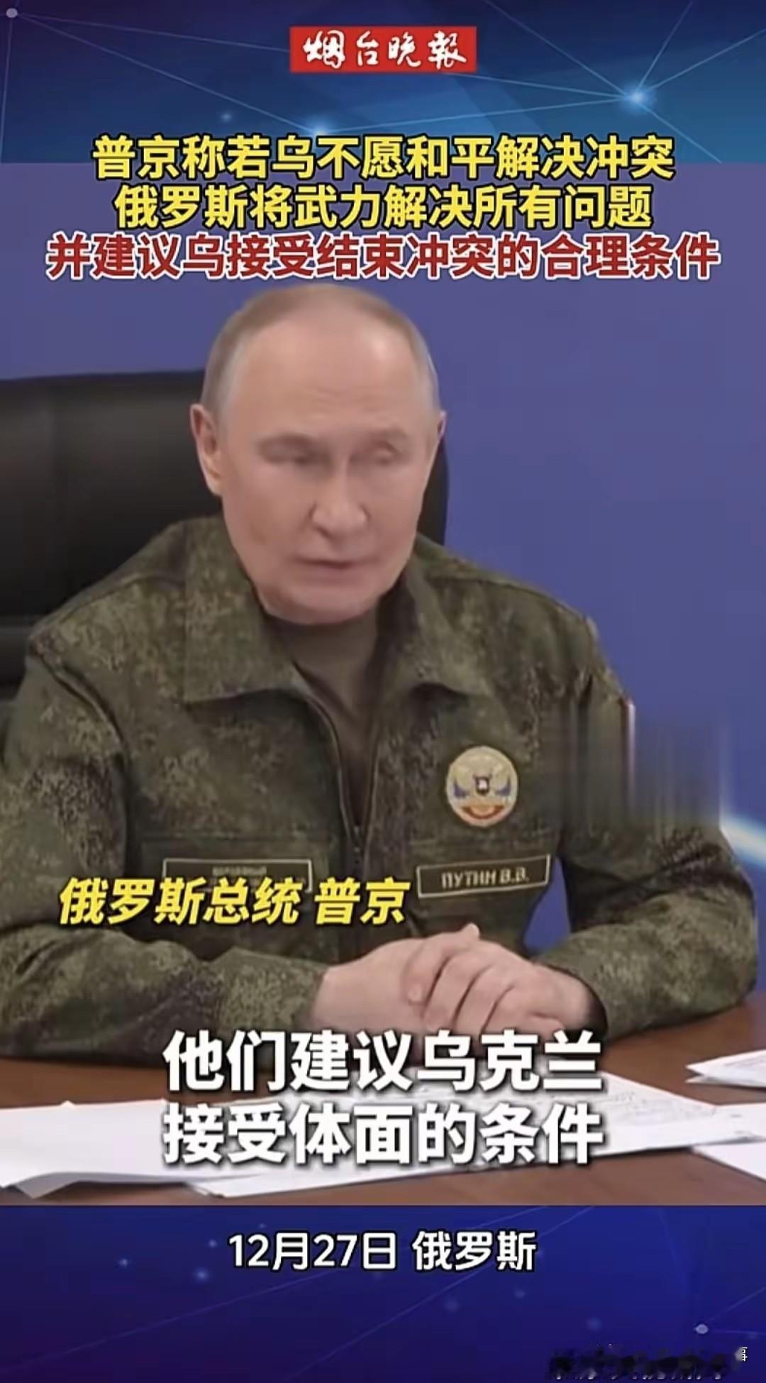 当地时间12月27日,俄罗斯方面又在对乌克兰喊话,要其接受体面和平,并认为现在的条件比较合理,是最好的考虑的阶段。 乌克兰虽然对此没有明确回应,或许也不屑于回击,毕竟战争已经打了1400天。如果俄攻势厉害,乌境早就被它打穿了,主战线还在顿巴斯波克罗夫斯克至库皮扬斯克一带,这叫个什么事。 这仗打了快一年多了,两边都杀红了眼。顿巴斯那地方早就被打烂了,到处都是焦土,每一寸地皮下面都埋着人命。现在俄方喊话谈和平,说白了就是仗打得吃力,后勤跟不上,兵员也紧张,想借着谈判的机会缓一缓劲儿,歇口气。 乌克兰那边保持沉默是肯定的。因为俄方提的那些条件,本质上就是要乌方放弃主权和土地。这怎么行?前线的士兵还在拼命死守,后方的老百姓还等着回家,这时候要是点头答应,那就是把国家卖了,不仅对不起那些战死的兄弟,也对不起自己的良心。 更气人的是,俄方嘴里的“合理条件”根本就是霸王条款。不谈撤军,不谈赔款,也不谈以后的安全怎么保障,光让乌克兰单方面认怂。这哪是谈和平,分明是逼降。现在的战线僵持在顿巴斯一带,这也说明了俄军之前吹嘘的闪电战、大攻势全成了笑话。现在就是比谁更能熬,比谁的意志更硬。 说到底,这仗打到现在,两边都伤得不轻,根本没有赢家。要想真解决问题,就得都冷静下来,坐到桌子对面,互相给点面子,平等对话。那种靠吓唬人、靠施压换来的停火,根本长不了,随时都能再打起来。 各位读者你们怎么看?欢迎在评论区讨论。