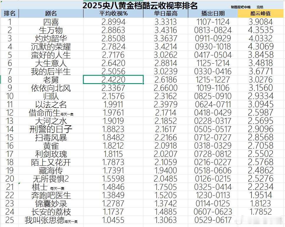 老舅 郭京飞、王佳佳《老舅》央八收官战报。来看排名。酷云集均2.4220,排名8/25CVB集均2.098, 排名9/25开播之前预测高了,因为我蜜汁自信你们喜欢的郭京飞