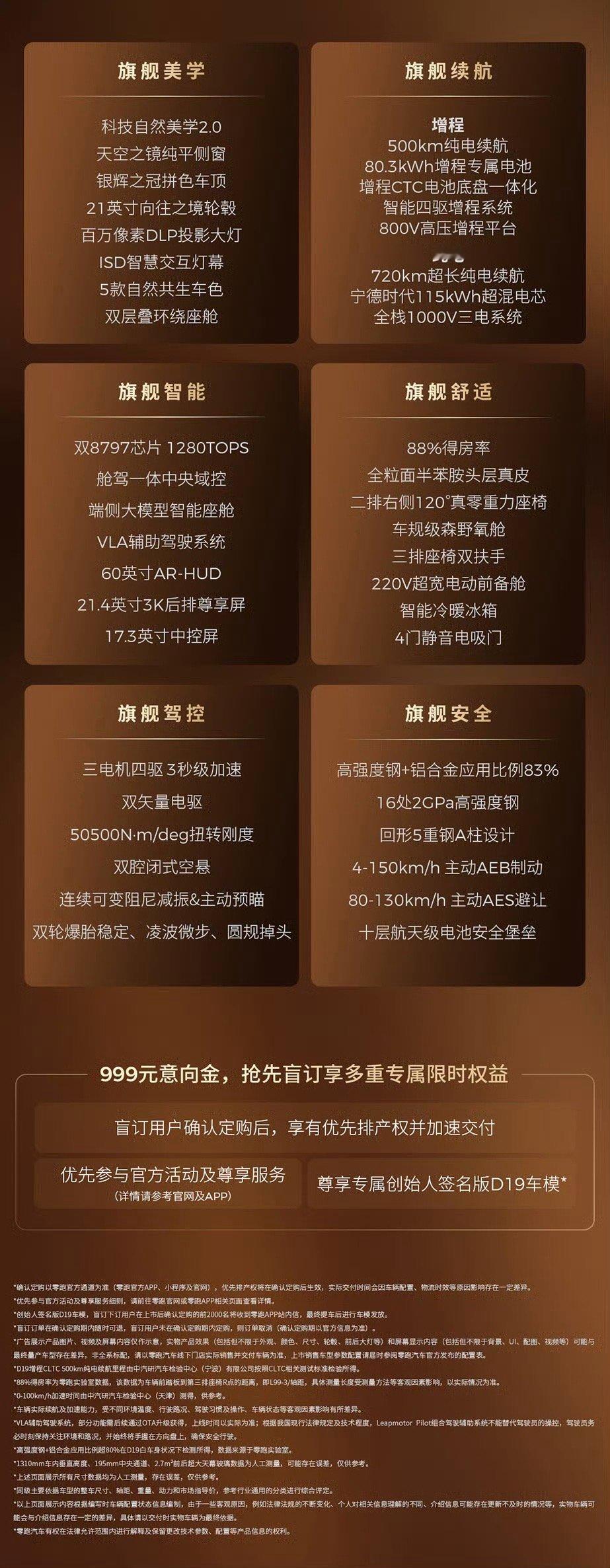 零跑十年磨一剑的旗舰SUV D19终于揭开面纱!6座/7座可选,全家出行再也不用纠结空间。看空间,二排右侧120°真零重力座椅往那一躺,长途坐车比家里沙发还舒服,七座版还能一键变大床,露营直接躺平超爽。纯电版前备箱大开口超方便,还有220V电源插座!80.3kWh增程电池+宁德时代超混电芯,续航完全不慌,还有车规级冷暖冰箱、森野氧舱,不管是长途自驾还是日常通勤,喝水有凉热、呼吸超清新!智能这块更是旗舰,全球首发双8797芯片,五屏联动+21.4英寸3K后排屏,看剧、控车都丝滑,三电机四驱,这么大车飙出3秒级性能,开着又快又稳!笼式车身+AEB自动紧急制动,全家出行的安全感直接拉满!豪华旗舰SUV,就应该像零跑 D19这样面面俱到!