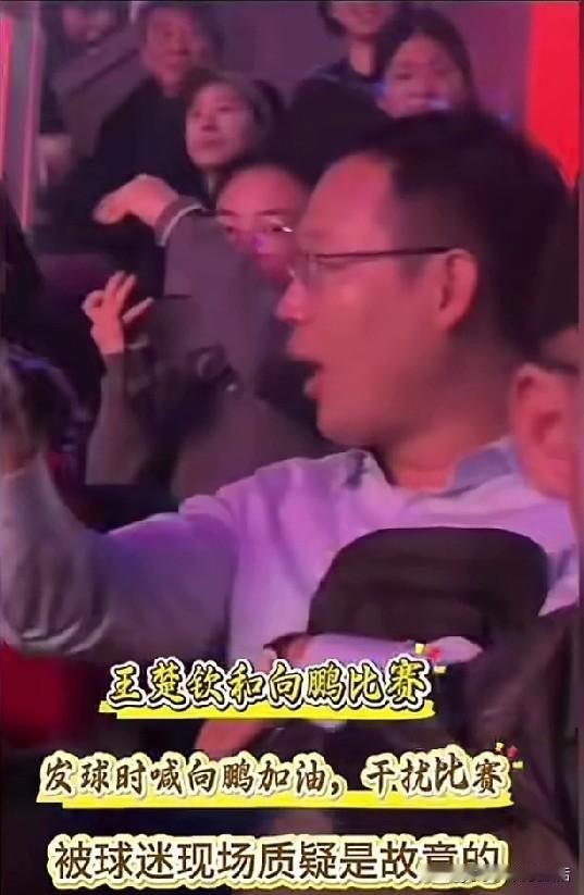王楚钦和向鹏的单打比赛中,王楚钦发球时,观众席上突然有个戴眼镜的男子嗓音浑厚的大喊“向鹏加油”!干扰了王楚钦发球。这个人的举动让向鹏和王楚钦都很是生气。 其实,这种突兀的喊声不仅干扰的是发球一方,同时也干扰了接发球的一方。当时向鹏正处在连续追分的时候,由4;8连续追到7:8 。王楚钦当时正没办法解决这种局面,他这么一喊,王楚钦停止发球,向鹏自然注意力也被打断。这样相当于一个小的意外暂停,把两个人的节奏同时打断。对于王楚钦不是好事,但是对于向鹏而言更不是好事。也恰恰由于他这一嗓子打断了向鹏追分的节奏。 看台上的男人被周围的人质疑和谴责后说自己不懂,引得众人侧目而视,不知道他尴尬不尴尬。或许后面就成了直播间的专属黑子。