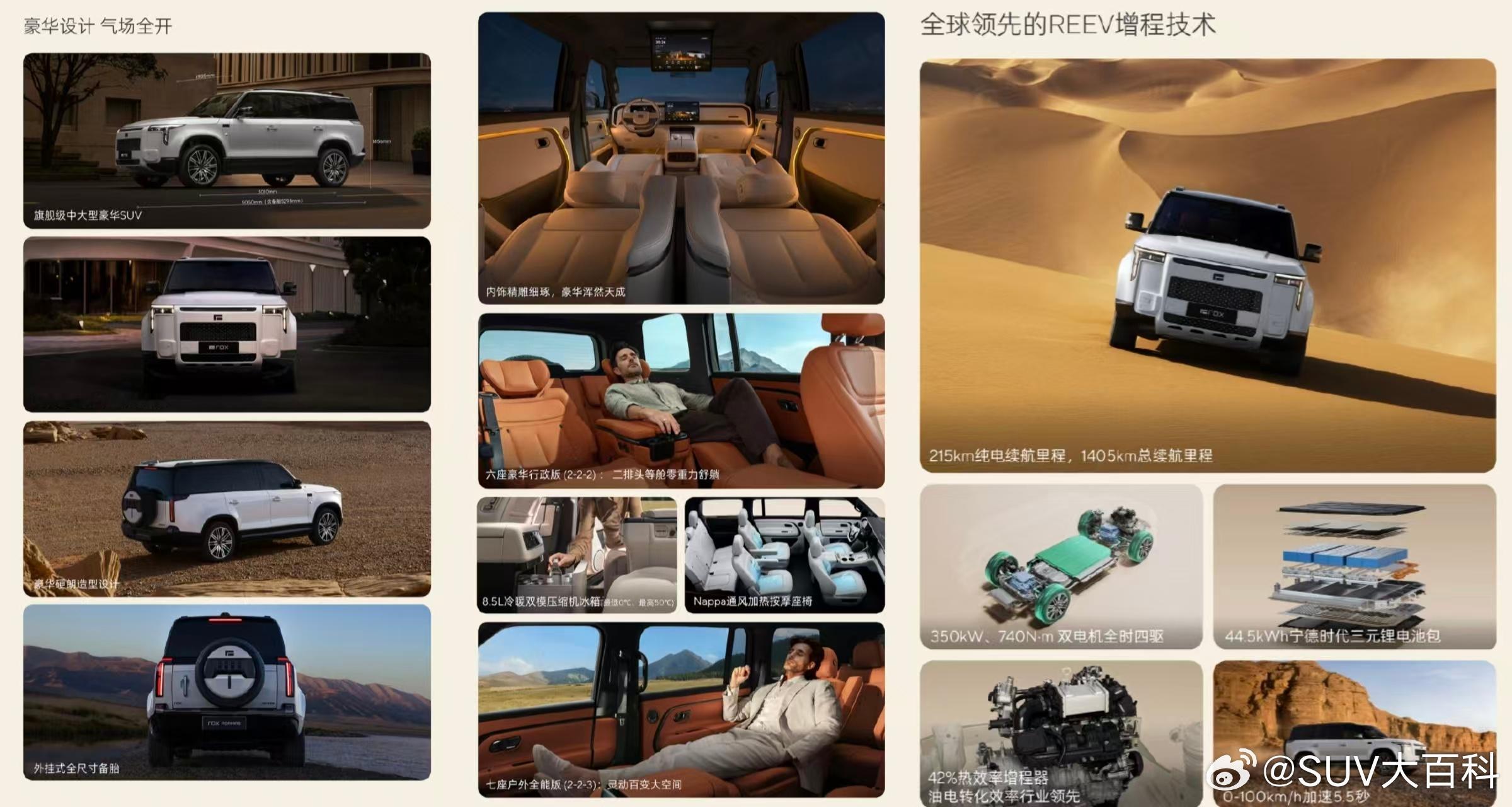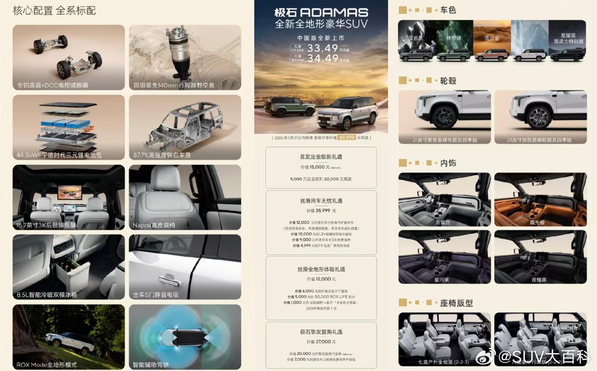 极石01 改款之后,名字也跟着海外版本改叫ADAMAS了,甚至还称其为“中国版”,说明确实对“墙内开花墙外香”的成绩颇感自豪先看价格,七座版权益价33.49万元,六座版权益价34.49万元,都不算很便宜,介于领克900高配和问界M8低配之间用这个价格你能买到什么呢?智驾一般,没有激光雷达,芯片只剩地平线J6M(128TOPS),高速NOA顶天了内外设计也和老款区别不大,七座223布局,带中央过道,偏向全家出游;六座222布局,头等舱二排零重力座椅,主打4+2出行方式配置还算说得过去,有14扬7.1声道音响、前后15.7吋3K屏、8安全气囊、压缩机冰箱、5.7kW外放电(2.2kW+3.5kW)、闭式空簧(-60~+80mm可调),再加上44.5度电和215km纯电续航,日常通勤也够用但是看到友商这么卷,这些配置可真心经不起比较啊……极石也意识到了这一点,所以把销售重心放到国外,之前在广州车展还推出了符合中东用户口味的Royal Edition(皇家版),要价99.88万元!该车有着金属粉白&哑光金双拼车身,搭配专属轮毂与悬浮LOGO,黑色菱形拉花灵感源自中东传统服饰“Thobe”内饰以沙棕、皓白双色布局,融合珍稀的沙比利天然球沙木饰板,以及绣有中东皇室宫殿菱形格纹的奢华半苯胺真皮座椅……考虑到极石海外均价都卖到8万美元以上了,这车海外售价不得干到12万美元以上?SUV大百科大v聊车