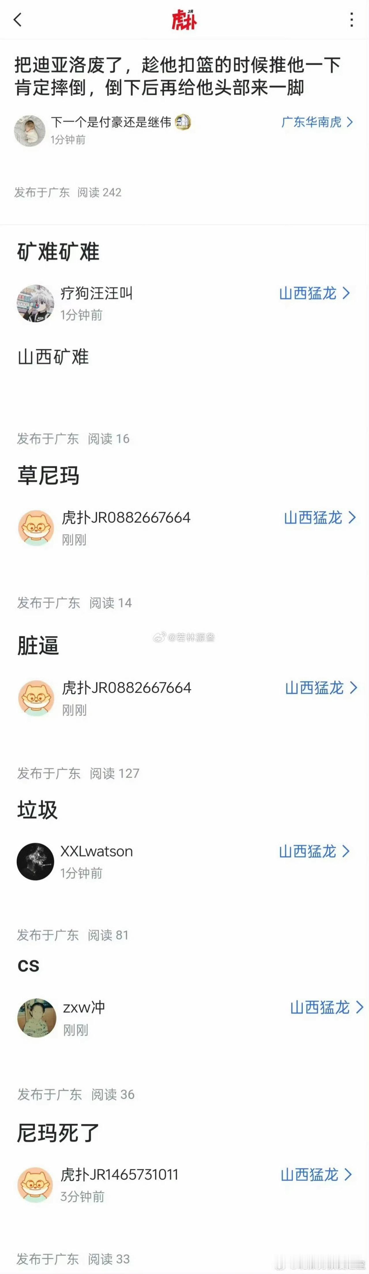 当广东IP喊出矿难的话时,这些人迟早会遭天谴!一场篮球赛,滋生出许多是是非非,这也是晋粤大战带给球迷津津乐道的话题。站在山西球迷一边,能看到的是王少杰肘击迪亚洛的恶劣行为,被裁判轻描淡写地用一个技术犯规化解。站在广东球迷一边,能看到的是迪亚洛为摆脱车轮纠缠不清的防守,而采取了多次非篮球动作。站在裁判员角度,双方球员的动作究竟够不够违法体育道德,以吹罚结果论处,裁判员以裁判规则为准。站在中立球迷的角度,看到了上赛季两队结下梁子的延续性,迪亚洛情绪波动的问题,换做普通人应当理解:一场比赛中张皓嘉、胡明轩、杜润旺三个违体对付一个迪亚洛,写下CBA了之先例。无论谁,再次见面意难平也很正常。因角度不同,立场不同,看法不同,所以判断出的结论不同都属于正常范畴。来自北京的媒体人指出:广东球迷真没必要这样,和你们去年季后赛的动作比,迪亚洛这动作算什么?他还列举出季后赛前五场比赛1夺权7违体4技犯分球员花名。如果这样看来,对球赛的讨论还算是理性。但是,网络上惊现广东IP又开始一轮的倾倒垃圾。上赛季喊出“飞机坠地”的话,这次又故意艾特山西猛龙俱乐部故意攻击球员、攻击地方、刻意搞地狱黑,盼望出现”矿难矿难”时,这些IP背后的人似乎和嗑药的魔鬼无异,他们踩在了违法的红线上。网络不是法外之地,有人迟早会管你:一时逞能过嘴瘾,一生悔恨终生痛。篮球舆论权一直以广东称霸一方的格局迟早有一天会被击破。