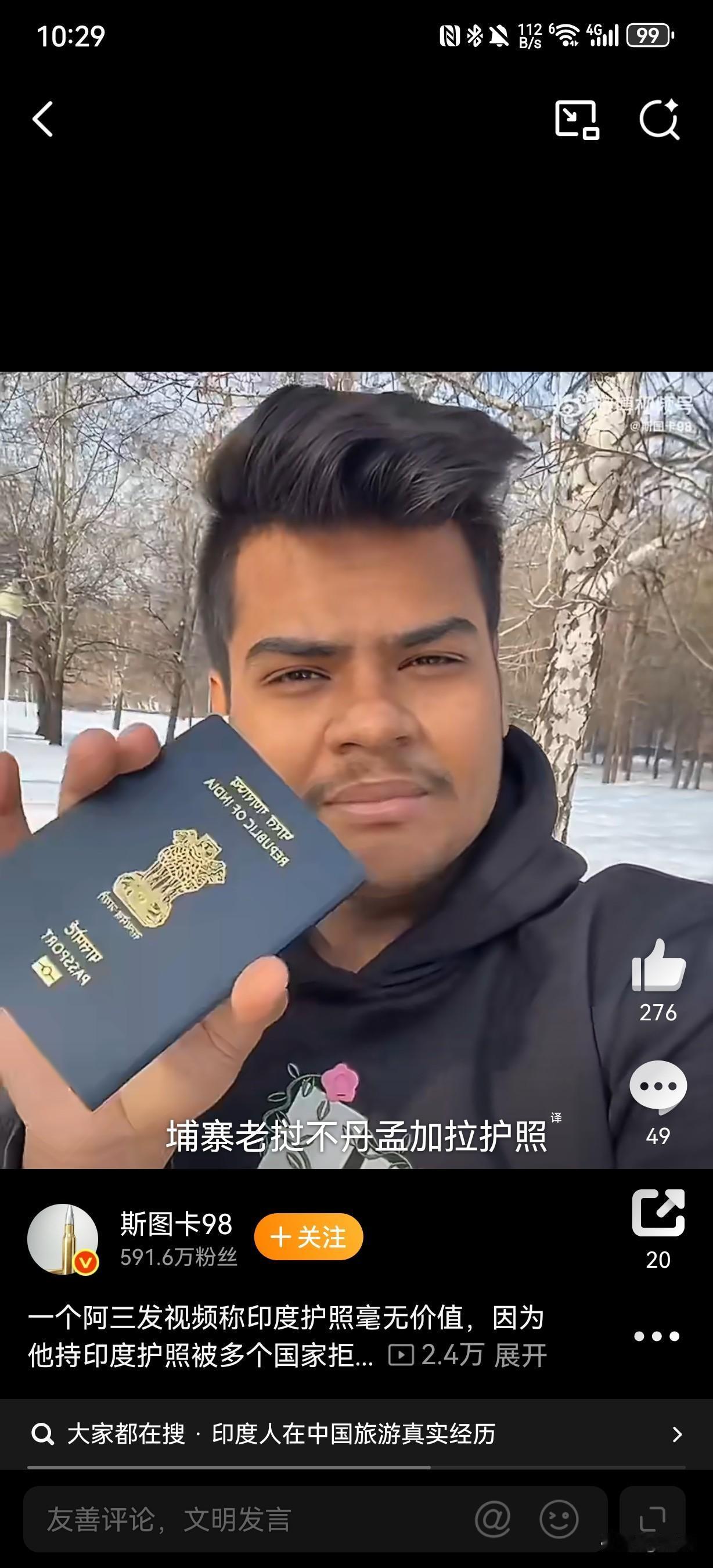 一个阿三发视频称印度护照毫无价值,因为他持印度护照被多个国家拒签还嘲笑它 至于什么原因,自己心里没点数吗?阿三是一个不受人类欢迎的种族,走到哪儿臭到哪,谁愿意老鼠来呢? 评论区: 聚是一坨屎,散是满天稀