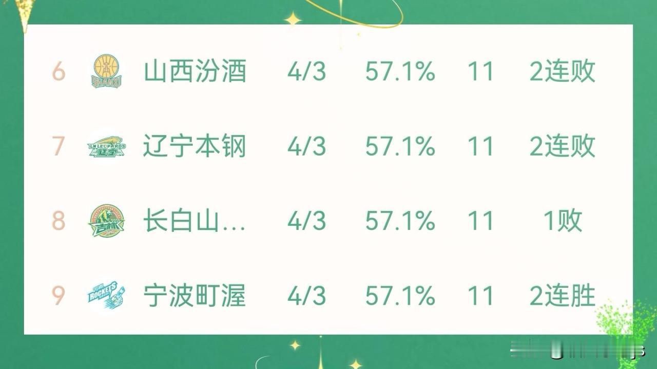 新赛季,CBA联赛打到第七轮,4胜3负的四支队伍有辽宁队、山西队、吉林队和宁波队