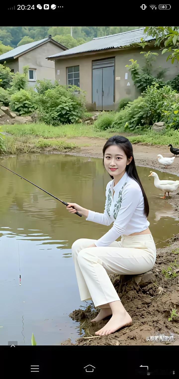 天净沙·村外小景 村塘天影澄鲜, 白鹅滩上闲眠。 少女垂钩意倦。 鱼踪难见, 钓心愁绪绵绵。