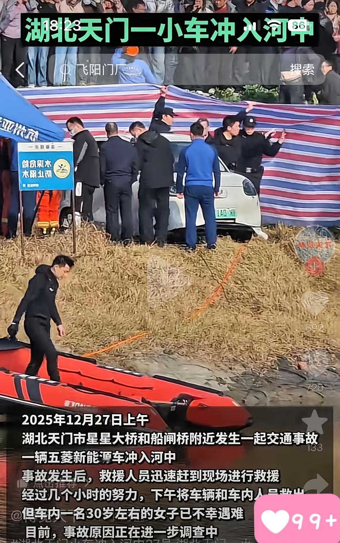 湖北天门,一个才26岁的姑娘,开着新能源车冲进了河里。她驾照刚到手没多久,那天早