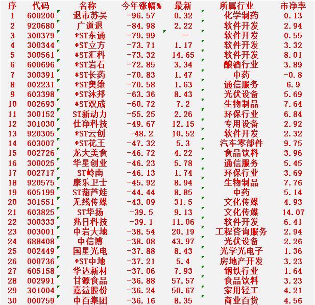 2025年以来,整个市场“跌幅最大”的30个股!退市苏吴:今年跌幅-96.57%,最新价0.32元,市净率0.13广道退:今年跌幅-84.98%,最新价2.22元,市净率2.94*ST东通:今年跌幅-79.99%,最新价—(停牌或无交易),市净率0.55*ST立方:今年跌幅-73.71%,最新价1.17元,市净率3.32*ST汇科:今年跌幅-73.32%,最新价14.65元,市净率8.01*ST岩石:今年跌幅-72.85%,最新价3.34元,市净率3.89*ST长药:今年跌幅-70.83%,最新价1.47元,市净率-0.80(净资产为负)*ST奥维:今年跌幅-70.58%,最新价1.63元,市净率6.90