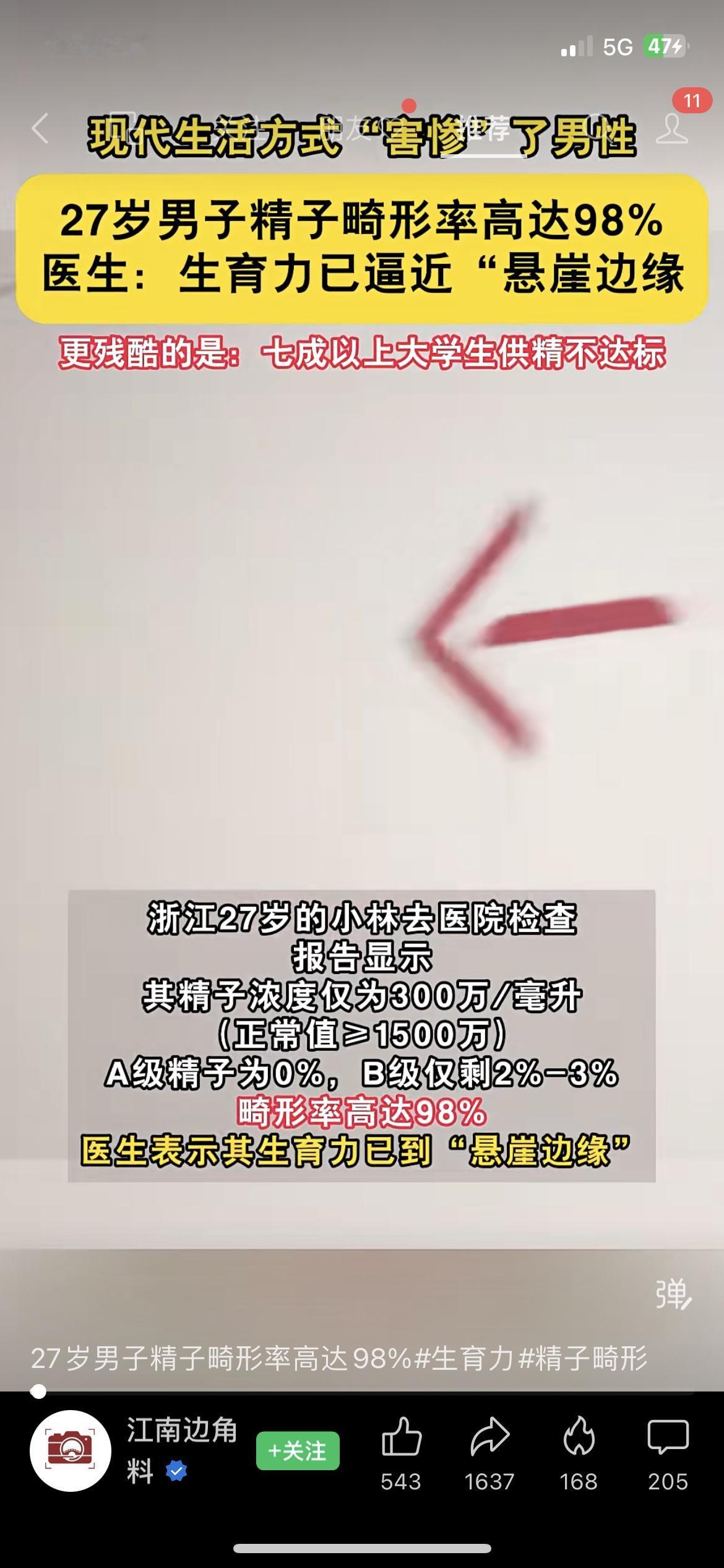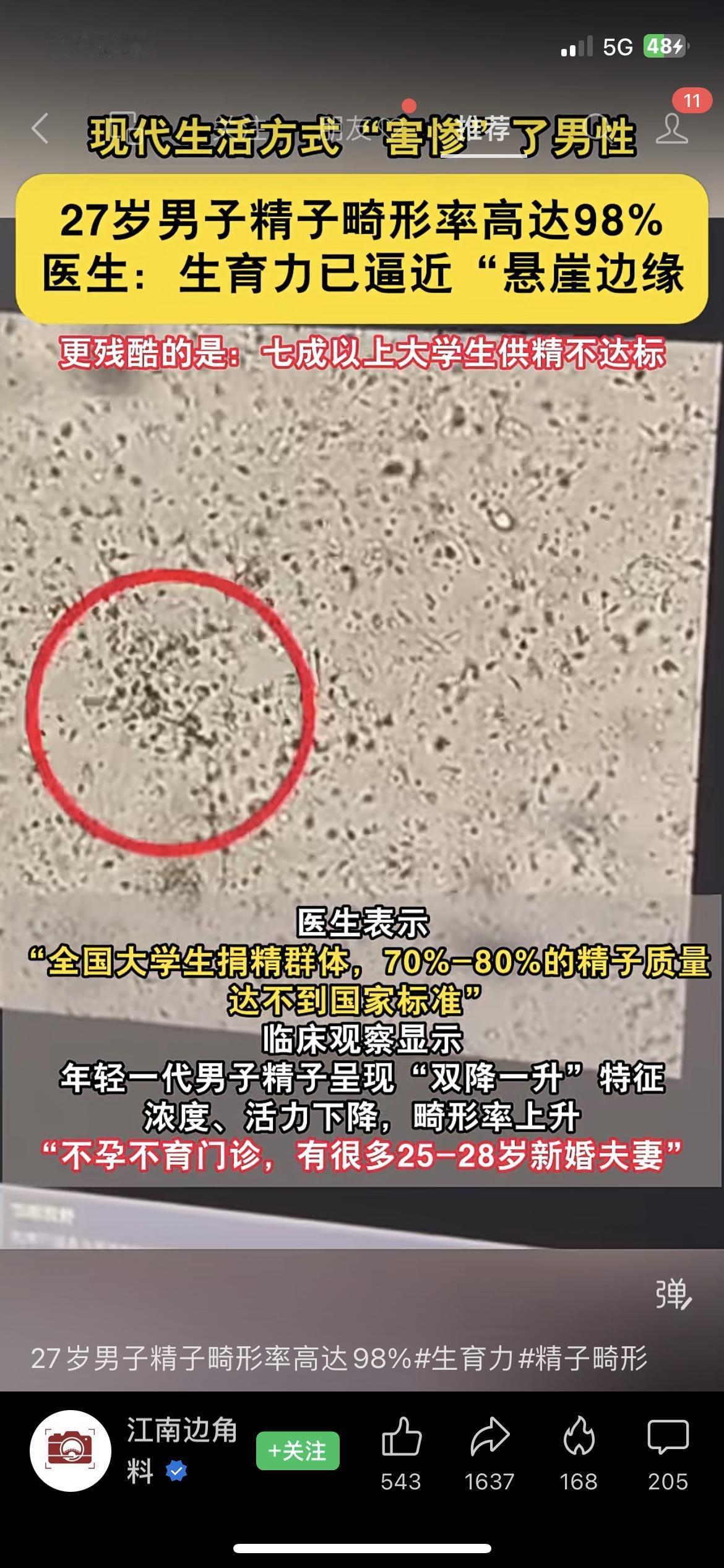 27岁小伙生育力踩悬崖!大学生捐精七成过不了关男性健康 杭州27岁的小林,拿着婚检报告手都在抖:精子畸形率98%,A级精子直接为零,医生说他的生育力已经到了悬崖边缘。 追问原因才发现,他每天熬夜刷短视频到凌晨,上班久坐八小时以上,外卖顿顿重油重盐。 更扎心的是,全国大学生捐精群体里,七成多的人精子质量都达不到国家标准,年轻男性精子浓度、活力双降,畸形率却一个劲涨。 现在不孕不育门诊里,二十五六岁的新婚夫妻占了一大半。 你身边的年轻男性有哪些伤生育力的生活习惯? 该怎么调整才能守住生育力? 精子 精子质量报告 精子质量分析