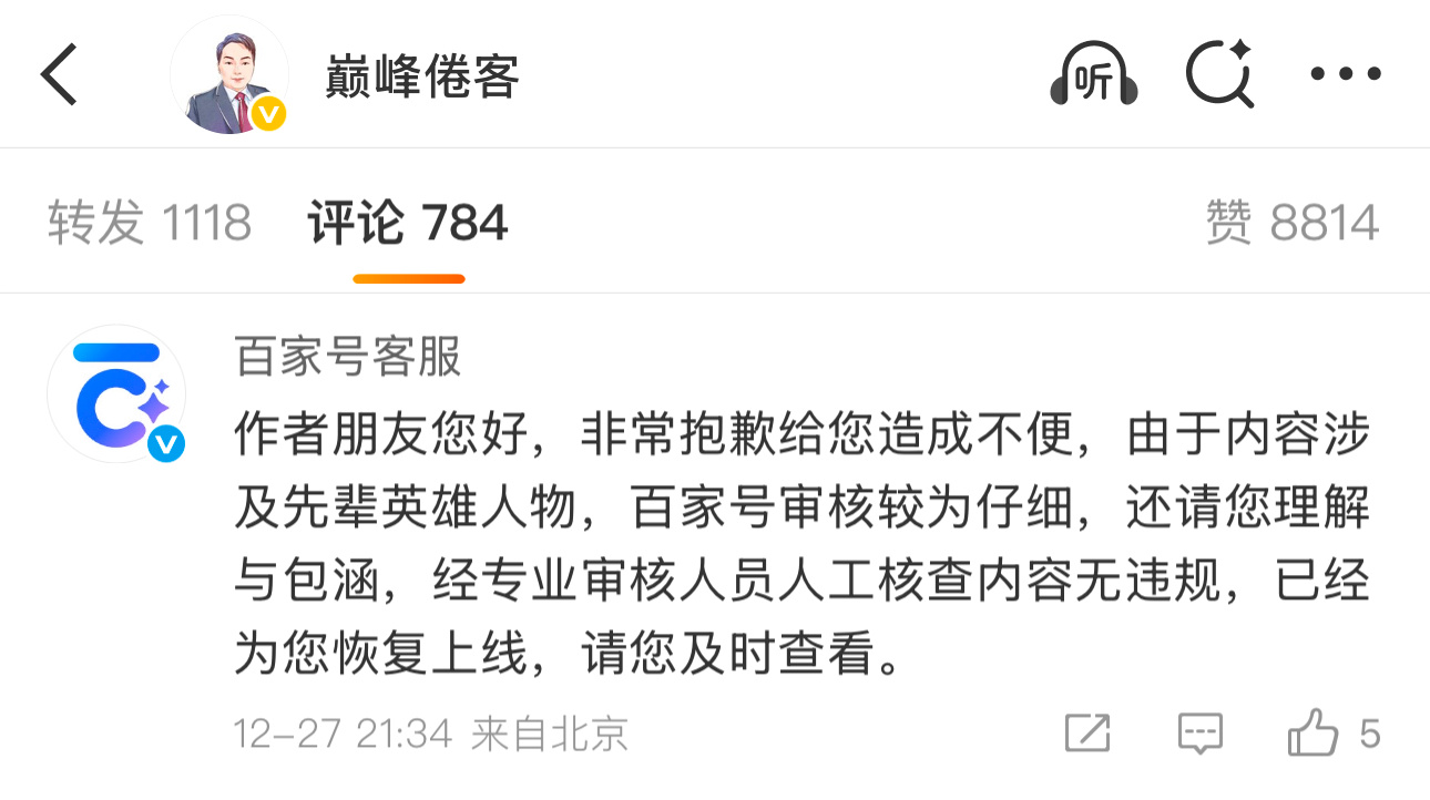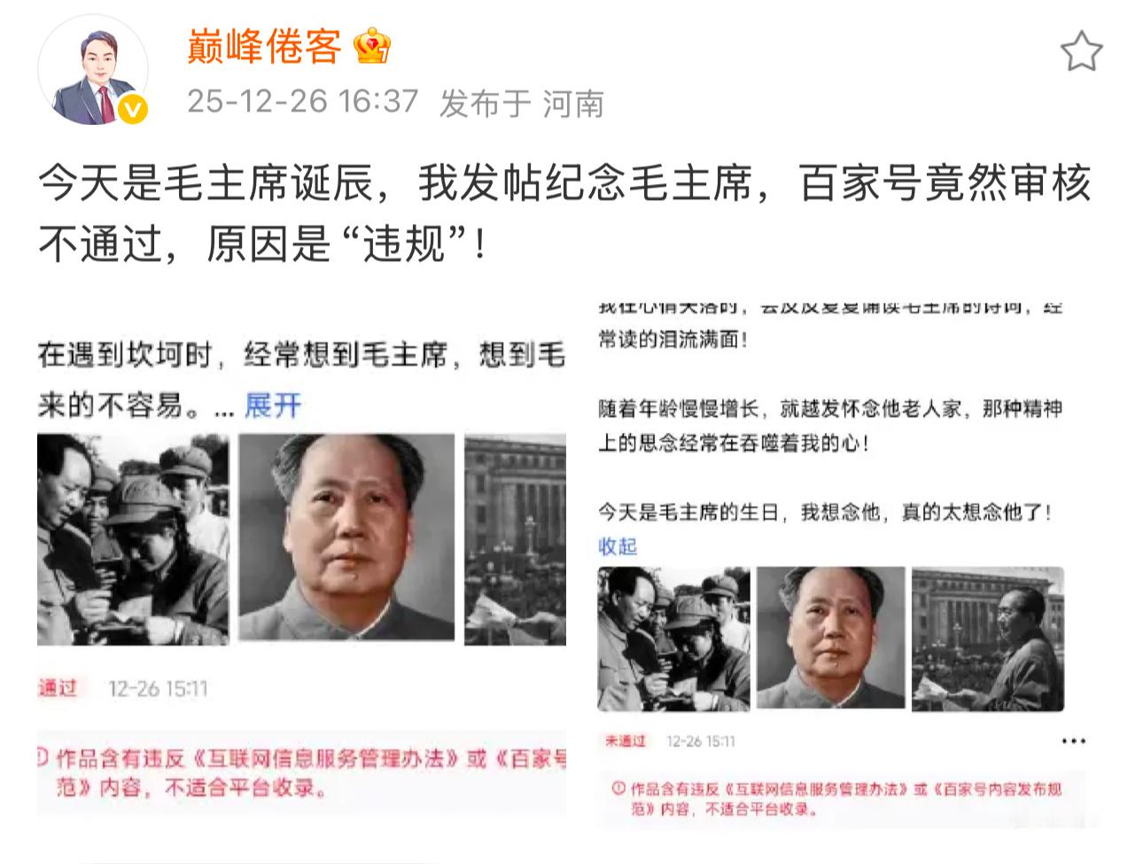 网友在毛主席诞辰的时候发帖纪念,百家号审核不通过,原因是“违规”! 百家号客服先是确认违规,再是要求提供作品链接,专业人士又证实不违规,完全体现了作品审核的随心所欲以及平台回复的机器人式操作