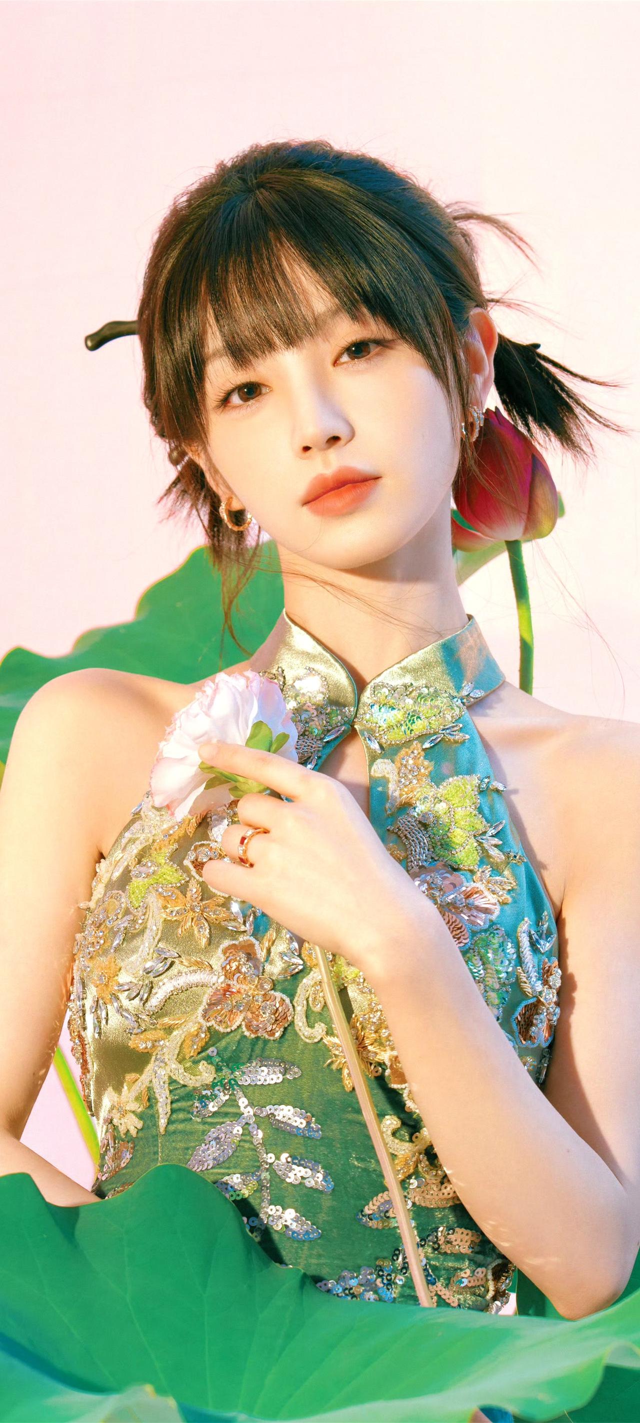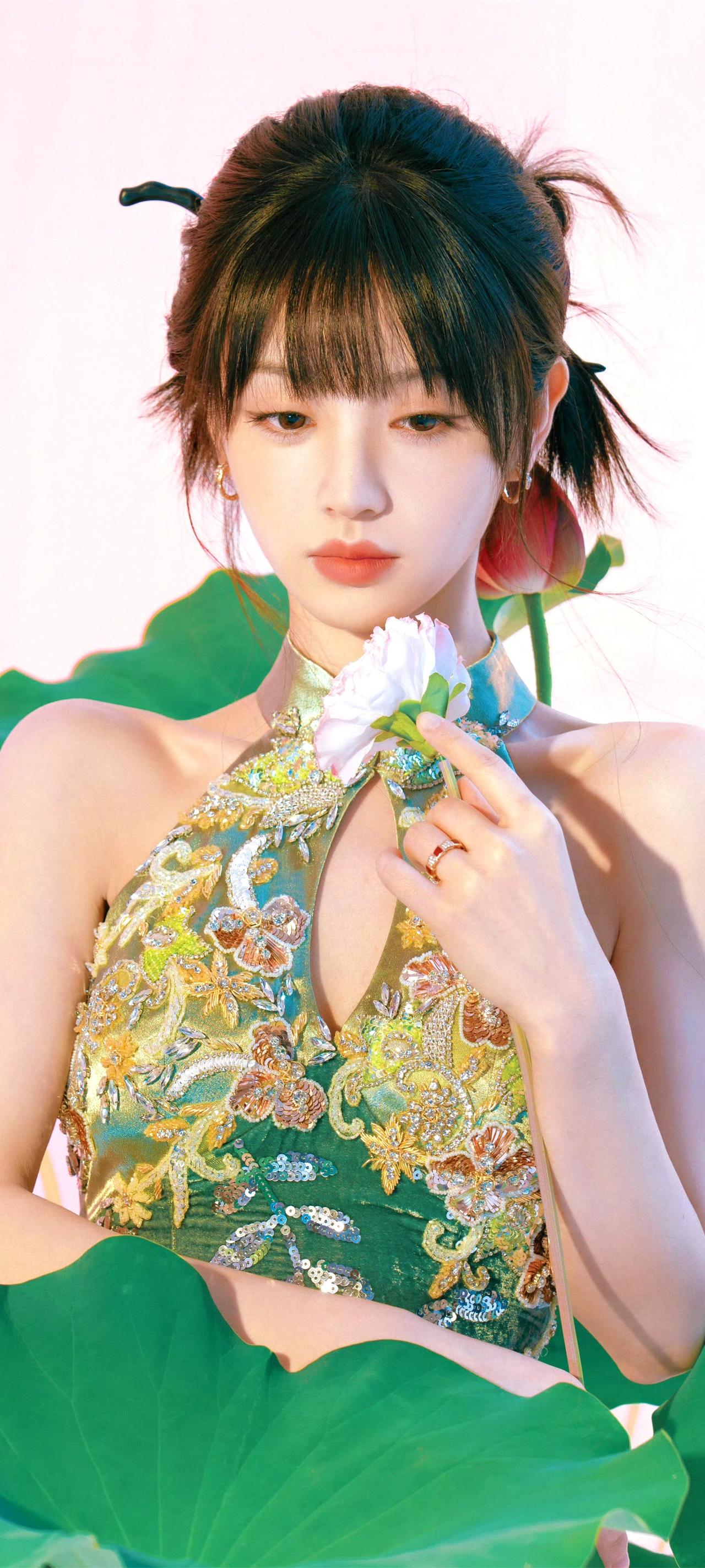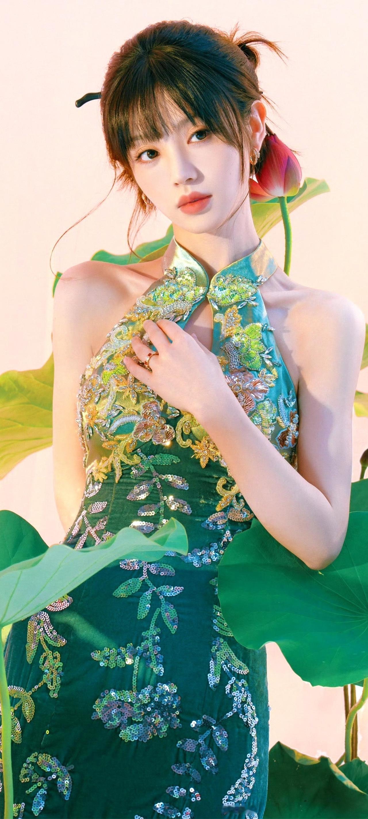 田曦薇荷花旗袍造型杀疯了!🍃 墨绿旗袍缀满碎钻流光,搭配荷花布景,江南水乡的灵动感拉满,甜妹秒变清冷国风美人,这颜值和氛围感谁能不爱~田曦薇 明星造型 国风旗袍 壁纸分享~