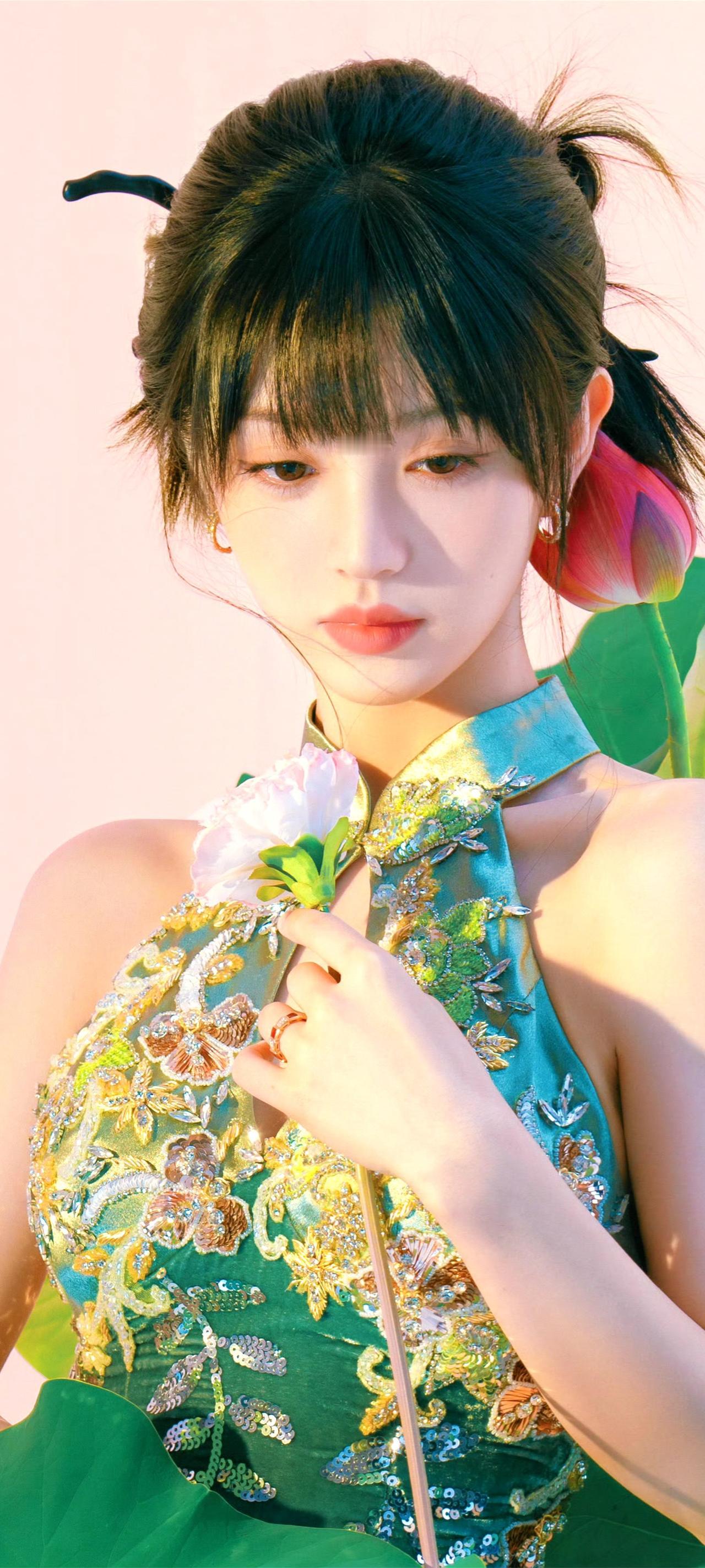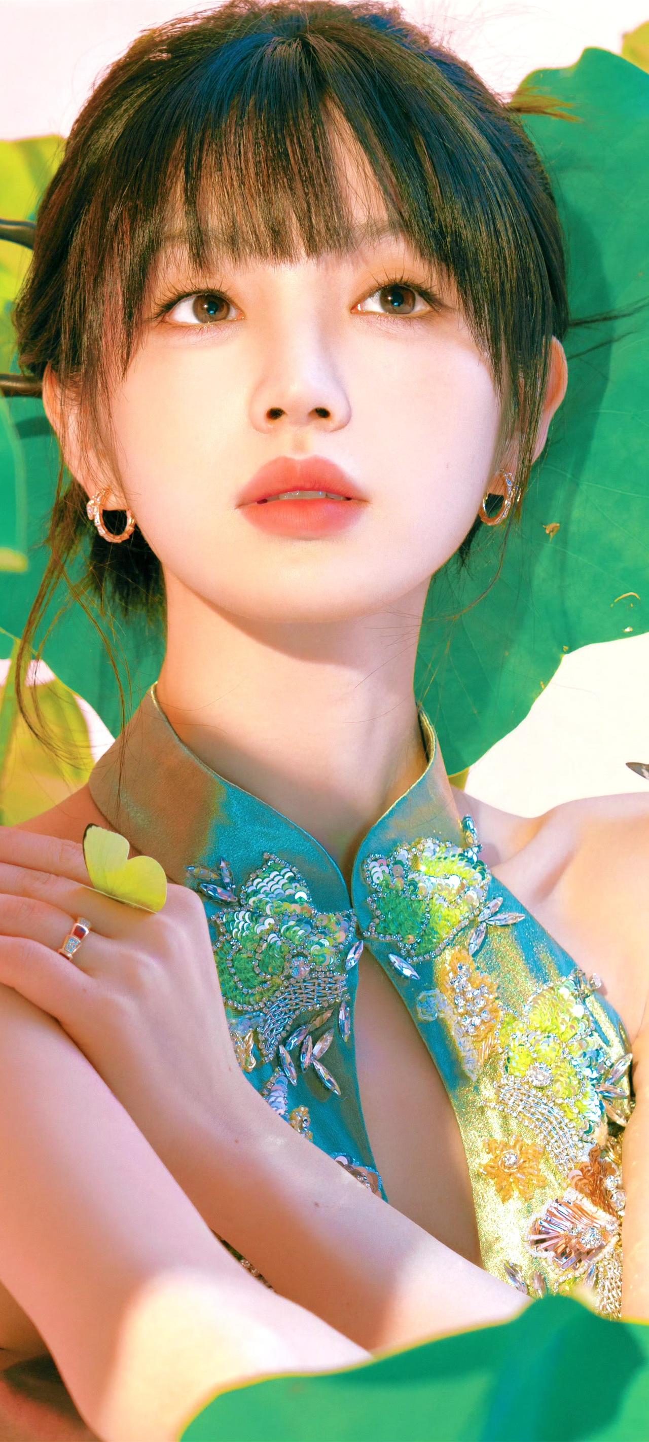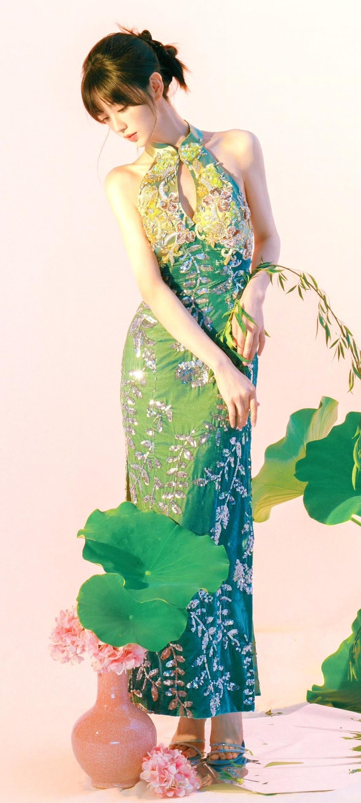 田曦薇荷花旗袍造型杀疯了!🍃 墨绿旗袍缀满碎钻流光,搭配荷花布景,江南水乡的灵动感拉满,甜妹秒变清冷国风美人,这颜值和氛围感谁能不爱~田曦薇 明星造型 国风旗袍 壁纸分享~