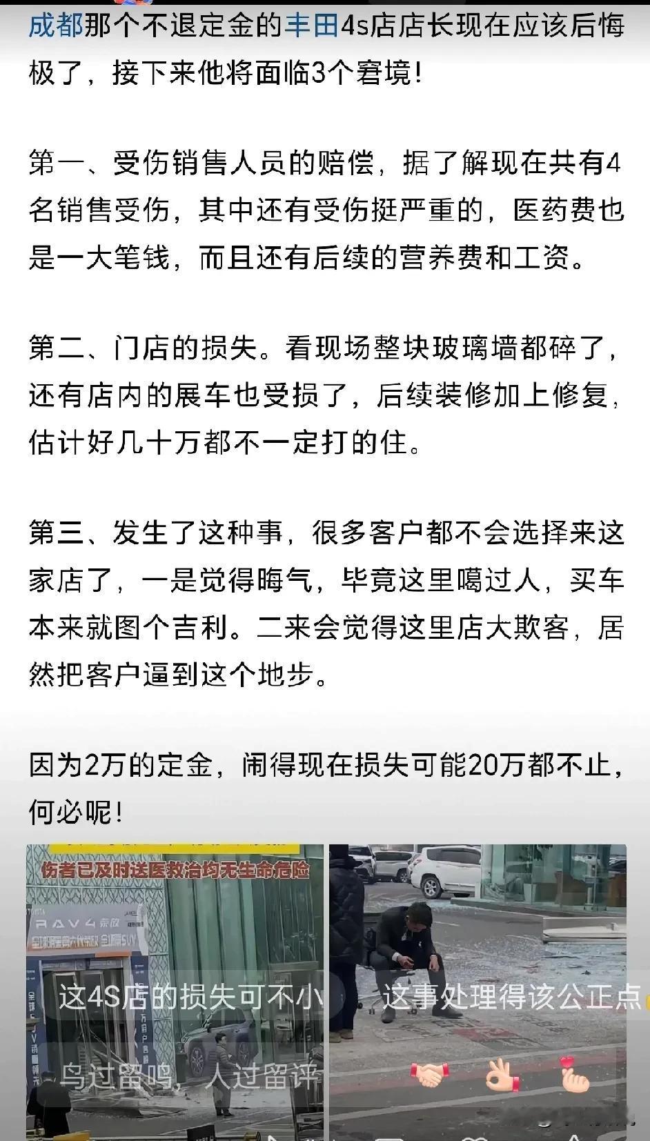 成都那家4S店的店主,做梦也没有想到,为了两万元定金,竟然闹出这么大的事端 如今不说直接损失 单就人死在大门口,以后这地方就成了死地,赔不死才怪 能开这么大的店,从来不会想到有人会为了2万元而不要命了 现在后悔也没有用了 这就是弱肉强食思维下的悲哀