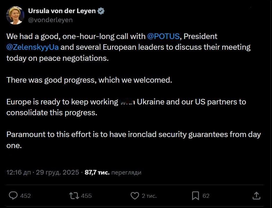 已经取得了进展,我们对此表示欢迎。欧洲愿意继续与乌克兰以及我们的美国伙伴合作,以巩固这一进展。这些努力的关键在于从第一天起就提供坚如磐石的安全保障," 欧盟委员会主席乌尔苏拉·冯德莱恩在与特朗普、泽连斯基以及几位欧洲领导人进行一小时会谈后表示。会谈内容涉及今天美国和乌克兰就和平谈判举行的会议。俄乌局势关注俄乌局势最新展
