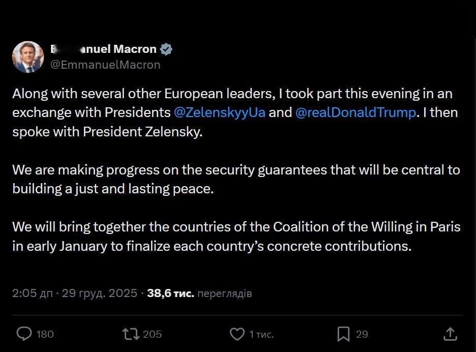 1 月初,我们将在巴黎召集有意愿参与的国家,敲定各国的具体贡献。我们正在推进安全保障问题,这对构建公正持久的和平至关重要。法国总统埃马纽埃尔·马克龙在与乌克兰总统弗拉基米尔·泽连斯基和美国总统唐纳德·特朗普交换意见后,并与乌克兰领导人进行了单独会谈。俄乌战争俄乌局势美国