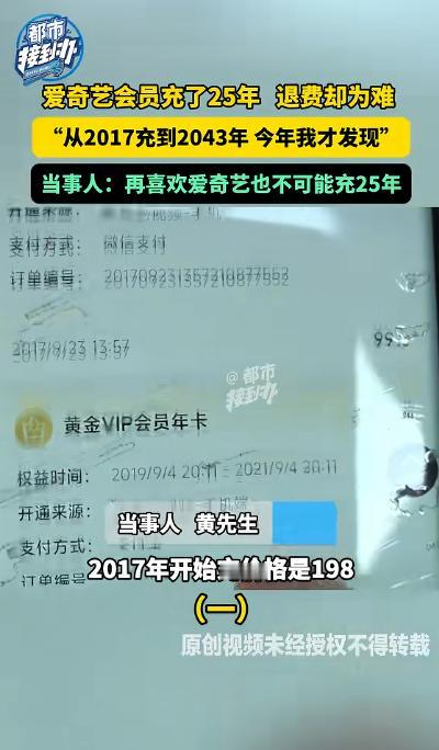 河南一男子在爱奇艺刷剧时,竟然发现自己会员,还有18年才到期,也就是2043年,他一开始还以为是系统漏洞,自己捡了大便宜,结果告诉家人后,却被告知,会员是家人当时一次性充值的,整整25年!从2017充到2043年,男子吐槽:再喜欢爱奇艺也不可能充25年!   近日,河南的郭先生(化名)观看电视剧时惊觉,他的的会员竟还有18年才到期,精确推算,到期时间为2043年。这一发现令郭先生大吃一惊,毕竟会员续费时间通常在一年或两年内,他的会员竟然会有如此长久的有效期。   起初,他以为是系统出现了漏洞,自己捡了一个“天大的便宜”,想着这也许是一次意外的错误,自己有幸碰上了。   然而,郭先生随即把这件事告诉了家人,没想到家人却告诉他,这一切并非是系统的错误,而是早在2017年,家人为了给他一次性充了25年的会员,支付了相当可观的一笔费用。   这一事实令郭先生愕然,他表示“再喜欢爱奇艺也不可能充25年”,原来,家人在当时的确觉得郭先生非常喜欢追剧,干脆一次性充值了这么长的时间,不仅省去了每年续费的麻烦,而且可以“稳稳地追剧”多年。   不过,郭先生对这一“充值计划”感到有些不解,他认为,25年的会员费用显然是不合理的,毕竟无论是从平台的服务内容,还是个人的需求来看,这样的长期订阅都显得过于超前和不切实际,而且,早在2021年,爱奇艺的部分会员政策和内容也发生了变化,郭先生觉得家人当初的选择可能并没有充分考虑到这些变化。   在郭先生发现这一异常情况后,立马就咨询是否能够退还多余的费用,爱奇艺的客服第一时间响应了郭先生的诉求,表示会根据相关规定处理退费事宜。   客服人员解释,由于他充值的账户已经停用,无法直接退还至原账户,因此,退费将会以确保同一人实名的账户为前提进行处理,并确保郭先生能够顺利拿到退款。   爱奇艺的迅速反应和专业处理也让不少网友点赞,有网友表示,虽然爱奇艺的会员制度有时会显得不太透明,但这次的处理速度和态度都非常及时和到位,给人留下了不错的印象。 当然,也有一些网友对郭先生家人当时选择充值25年会员的做法表示质疑,有网友认为,虽然一开始的初衷是好的,但长达25年的会员订阅确实过于超前,这种极长时间的续费安排,不仅无助于平台的良性运营,也容易让用户在未能充分了解会员权益变化的情况下做出不合适的决策。   而且,这种长时间的预付款模式,也让消费者在后期难以享受应有的灵活性和选择权,类似的情况,也促使一些用户开始思考,平台是否应该为会员设置更灵活、合理的订阅期,以便适应不断变化的市场和消费者需求。   总体来看,郭先生在爱奇艺会员问题上的经历,成为了网络热议的焦点,这个看似简单的会员续费事件,实则揭示了如今数字内容订阅市场中的一些潜在问题。   首先,平台应当更加明确和合理地设置会员政策,避免出现类似这样的端案例其次,消费者在选择订阅服务时,也应该更加谨慎,了解清楚各类服务的时间、费用、更新情况等,避免因冲动或不慎而做出不理智的决定。   但不管怎样,郭先生能够及时得知真相并获得退款,体现了爱奇艺客服的效率与专业,也让很多人看到了平台在处理用户问题时的责任感,这种快速有效的处理方式,足以成为消费者与平台建立长期信任关系的重要基础。 信息来源 :都市报道