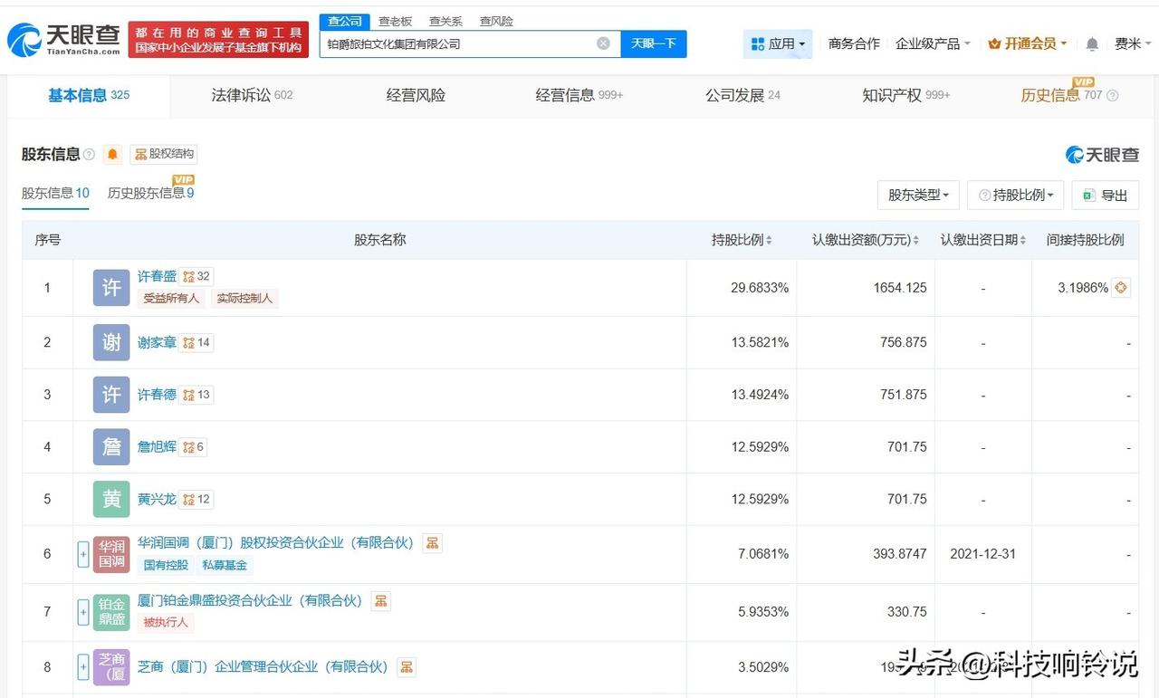 【铂爵旅拍及董事长等被执行7800万 铂爵旅拍及董事长等成被执行人】 天眼查法律诉讼信息显示,近日,铂爵旅拍文化集团有限公司、许春盛等新增一则被执行人信息,执行标的7800.2万人民币,执行法院为福建省厦门市中级人民法院。 该公司成立于2014年12月,法定代表人、董事长、总经理均为许春盛,注册资本约5657万人民币,经营范围包括组织文化艺术交流活动、摄影扩印服务、摄像及视频制作服务等,由许春盛、谢家章、许春德等共同持股。 天眼查信息: