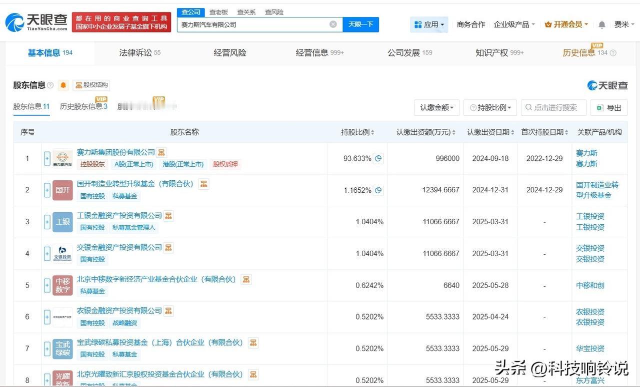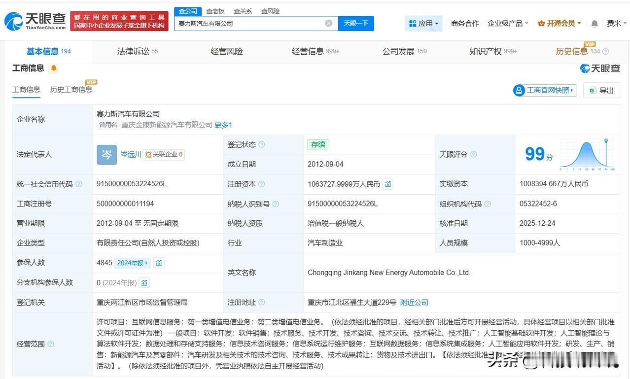 【赛力斯新增多项AI业务】 天眼查App显示,近日,赛力斯汽车有限公司发生工商变更,经营范围新增人工智能基础软件开发、人工智能理论与算法软件开发、人工智能应用软件开发等。 该公司成立于2012年9月,法定代表人为岑远川,注册资本约106.37亿人民币,由赛力斯(601127)、国开制造业转型升级基金(有限合伙)、工银金融资产投资有限公司等共同持股。 天眼查信息: