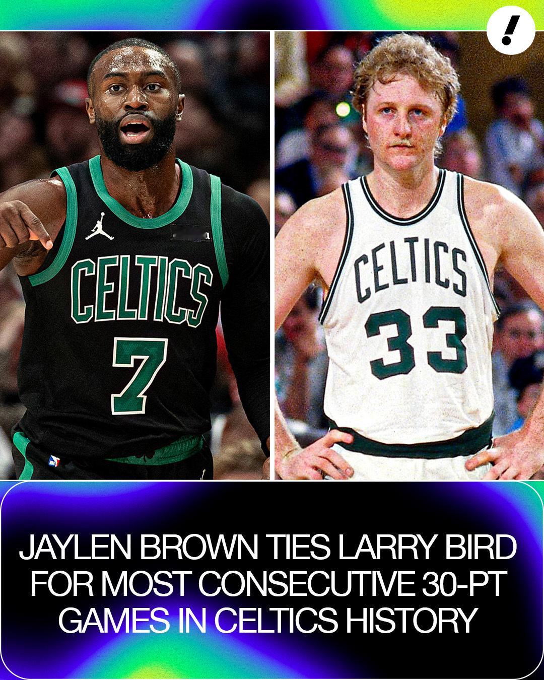 杰伦·布朗连续9场比赛30+,追平拉里·伯德的绿军队史纪录。凯尔特人vs开拓者N