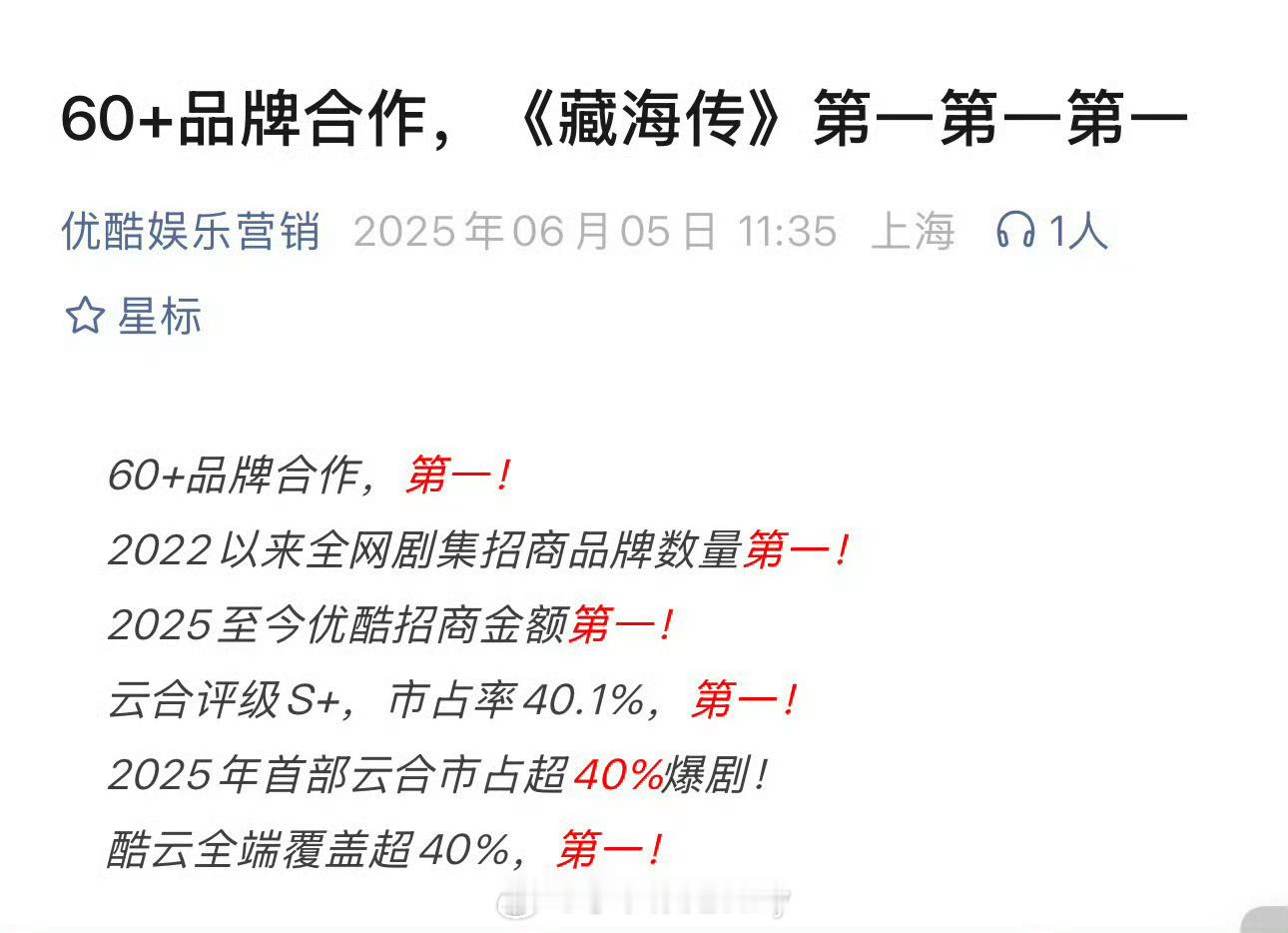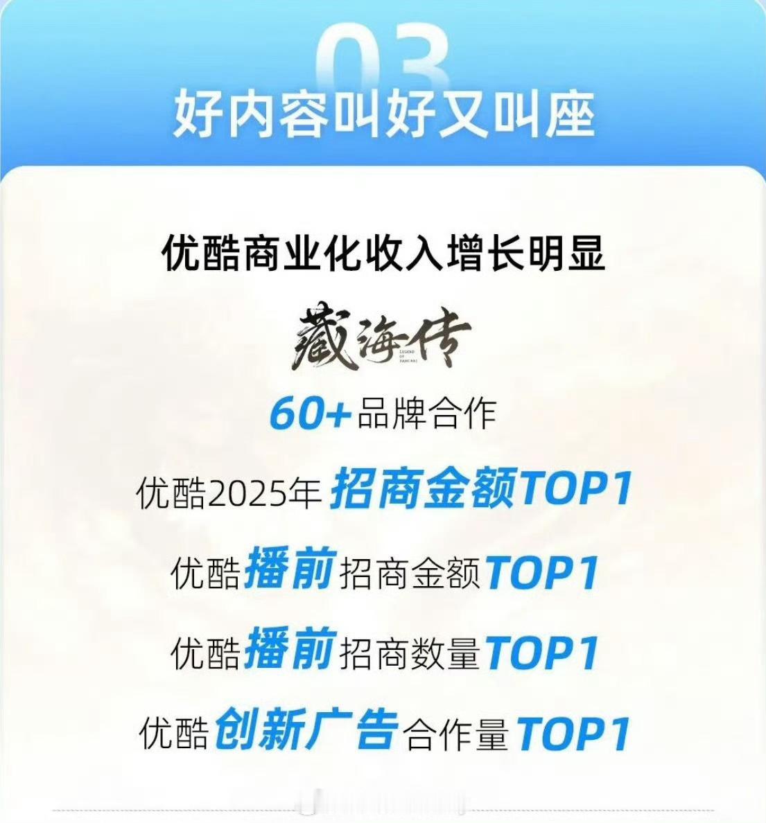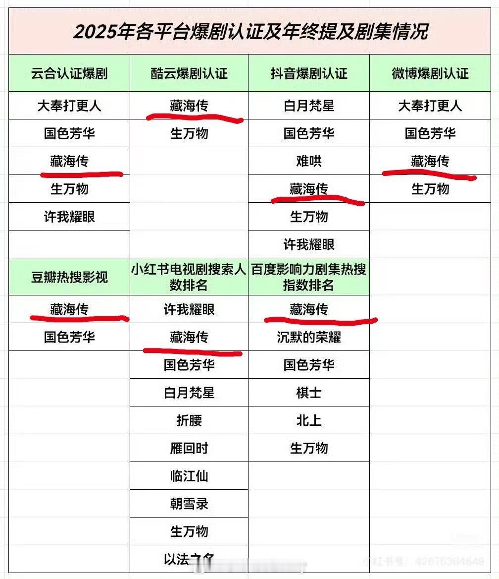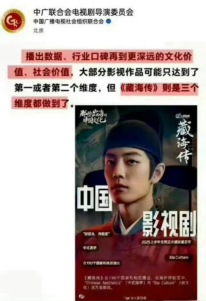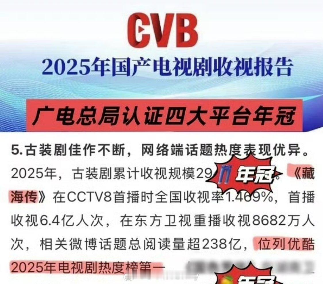 【藏海传2025剧王】1. 全方位大爆,云合、灯塔、猫眼播放量三榜年冠☝️2. 优酷官方认证现象级爆款🔥热度、招商、拉新、收入史冠3. CVB官方认证25年度收视爆款、热度一骑绝尘🔥4. 百度官方年终报告唯一封面剧集演员。25年度影响力第一剧王☝️5. 金莲花唯一最佳电视剧大奖获得者6. 海外IMAD全球百大电视剧25年唯一上榜 7. 小红🍠官方报告藏海传搜索人数、讨论次数优酷第一☝️全平台年亚。