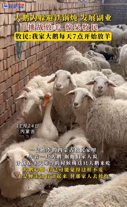 “解释不清了!”内蒙古一男子,因家中2只大鹅总打架,便把其中一只放在羊圈喂养,谁知,这大鹅竟然帮着管理100多只羊,每天领羊出去又带羊回来,来去十几公里路途,没出过半点岔子。网友:这只鹅算是活明白了! 张先生作为一个养殖业者,除了种植些作物外,还经营着几百只羊,然而,这些羊群的管理却一直让他头疼,特别是带领这些羊出牧、回圈的问题,往往因为羊群调皮,走失的事情时常发生,张先生因此不得不每天亲自忙碌于羊群的管理。 一天,张先生家里的两只大鹅因为争夺领地发生了激烈的争斗,两只鹅性格火爆,时常为争抢食物、栖息地发生冲突,弄得张先生非常头疼,为了避免它们继续闹事,张先生决定将其中一只大鹅暂时隔离开来,经过一番思索后,张先生决定将这只大鹅放进家里的羊圈,让它和羊群一同生活。 谁曾想,这个看似简单的安排,竟然改变了张先生农场的运作方式,起初,张先生只是想着这只大鹅能安静下来,避免与另一只大鹅再发生冲突,但很快他就发现了一个惊人的现象,这只被“软禁”在羊圈的大鹅,它不仅能与羊群和平共处,甚至开始有规律地管理羊群。 每天清晨,当张先生还在朦胧中醒来时,这只大鹅已经悄悄地带领着羊群从圈内走出,出发去往草原上吃,它总是走在队伍的最前面,仿佛在指引方向。 羊群的步伐整齐,丝毫没有走失,按照惯例,它们会在指定的草地上停留几个小时,等到中午时分,大鹅又会把羊群一 一召集起来,开始返回。 最让张先生吃惊的是,这只大鹅每天都会带领羊群来回行走十几公里的路程,往返的过程中从未出过差错,也从不迷失方向,尽管羊群中不乏年幼或体弱的个体,它们都能紧跟在大鹅的后面,几乎从未发生过跑丢或分散的情况,这个神奇的现象让张先生有些不敢相信自己的眼睛,甚至怀疑自己是不是看错了。 张先生不禁感叹,这只鹅竟然比他管得还好,他开始注意到,羊群回到圈内后,状态非常稳定,甚至比以往更加安静,这只大鹅不仅担任了“领队”角色,似乎也成了羊群的“守护神”,确保它们在出牧和归圈的过程中不发生混乱。 这种情形在张先生农场的日常中成了常态,每天无论是刮风下雨还是艳阳高照,更让人惊讶的是,张先生开始发现,这只大鹅似乎有一种天然的领袖气质。 每当羊群遇到分歧时,它总能站出来,用自己的方式把羊群重新集中起来,无论是经过陡峭的山坡,还是穿过茂密的草丛,大鹅总是稳稳地走在最前方,领着羊群顺利通过。 网友们得知这一事后,纷纷在社交媒体上评论留言,有网友表示,真是个奇迹,一只鹅竟然能管得了这么多羊,实在是太神奇了,也有网友开玩笑说,这鹅以后可以给牧羊犬上个‘进修班’,教它们如何当领队。 虽然张先生的故事听起来似乎充满了奇幻色彩,但这一切却发生在他家农场里,成为了他日常生活的一部分,大家都知道,养殖业并不是一件容易的事,但有时候,恰恰是这些意想不到的小插曲,给忙碌的生活带来了许多惊喜和温暖。 这只大鹅无意中肩负了起了领导羊群的职责,改变了张先生对农场管理的看法,而对于那只大鹅,它似乎也找到了自己存在的意义,不仅仅是避免打架,更是成为了羊群的守护者,带领它们走向更广阔的草原。 信息来源 :美丽浙江