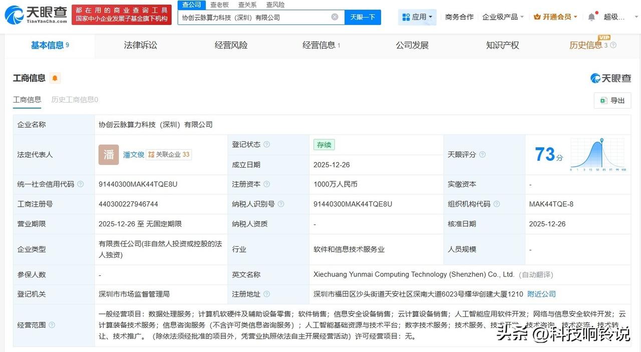 【协创数据在深圳成立算力科技公司 注册资本1000万】 天眼查App显示,近日,协创云脉算力科技(深圳)有限公司成立,法定代表人为潘文俊,注册资本1000万人民币,经营范围包括数据处理服务、计算机软硬件及辅助设备零售、软件销售、信息安全设备销售等。股东信息显示,该公司由协创数据技术股份有限公司全资持股。 天眼查信息: