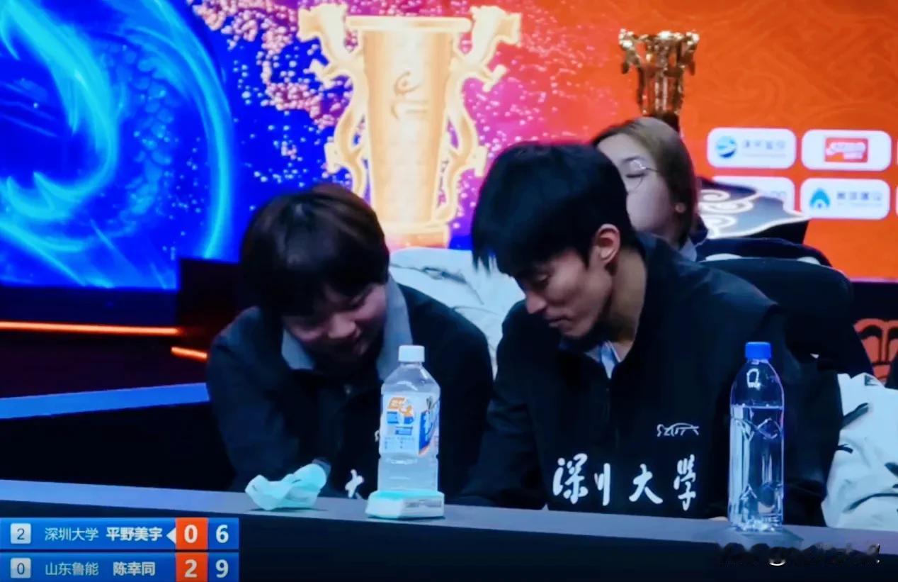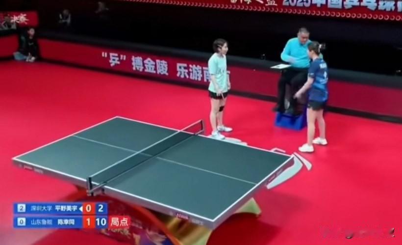 哈哈,平野美宇太可爱了,同同吃瓜吃到自己身上! 同同有一个擦边球, 裁判给了同同, 看到平野美宇怀疑的眼神, 同同秒懂, 马上和裁判说没擦边! 裁判觉得擦边了! 同同对平野说: 你请求鹰眼吧! 同同那八卦的小眼神, 也想知道到底擦边了吗? 结果鹰眼显示擦了侧边, 属于未擦边, 改判了比分!