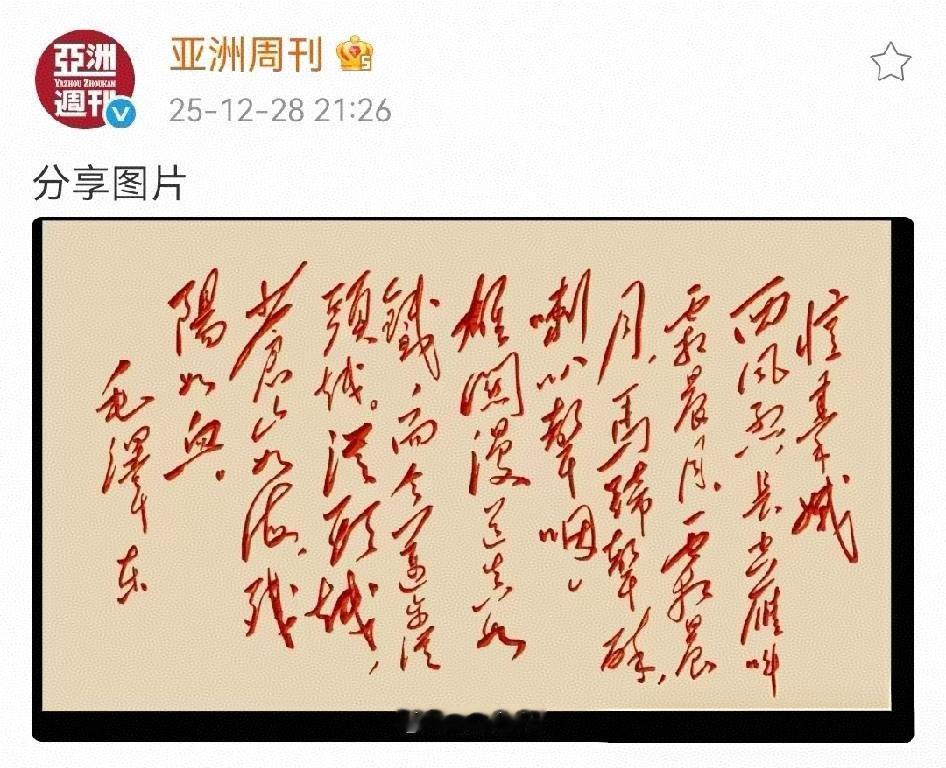 曲终人未散,干净了,也落幕了。 亚洲周刊一红一绿两诗词,就是他最后的倔强了。 这样的藏头诗要是没留意,肯定看不出来的。 最后一起欣赏下: 忆秦娥·娄山关 西风烈,长空雁叫霜晨月。霜晨月,马蹄声碎,喇叭声咽。 雄关漫道真如铁,而今迈步从头越。从头越,苍山如海,残阳如血。