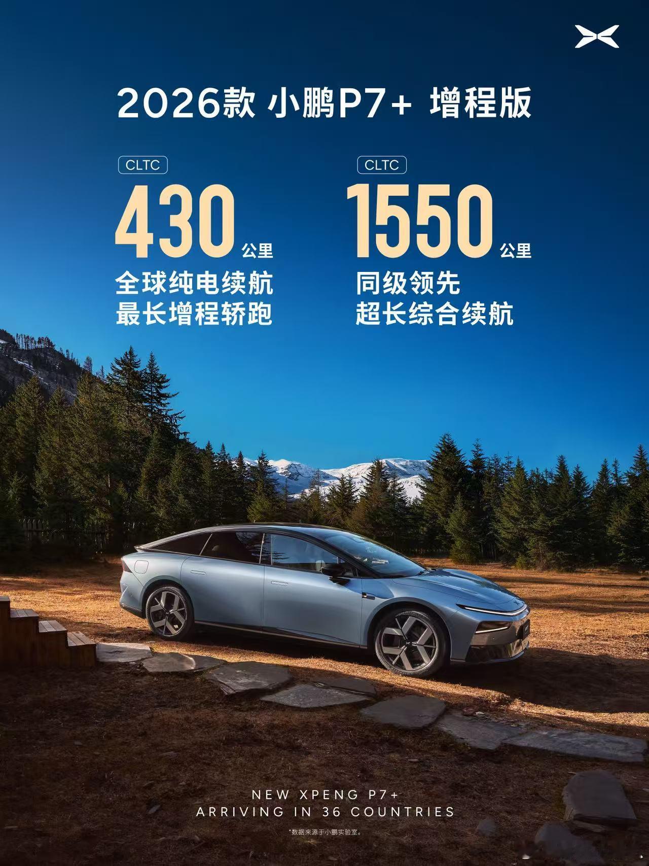 新款小鹏P7+即将全球36国发布新款小鹏P7+超级增程来了2026款小鹏P7+即将在全球36国发布,应用了全球化统一的生产和安全标准,是小鹏汽车首款面向全球发布的车型。2026款小鹏P7+提供一车双能,可油可电。增程版CLTC纯电续航里程430公里,是「全球纯电续航最长增程轿跑」,且CLTC综合续航里程1550公里,同级领先;纯电版焕新升级「857」:全系800V平台、全系5C超充AI电池、CLTC续航里程至高725公里。新款P7+作为年轻家庭的首选轿跑,保留了同级最大空间,座舱精致感和舒适性再进阶,实现104项的体验升级和36%的一级总成升级,不仅是年度改款,更是实打实的全面焕新。