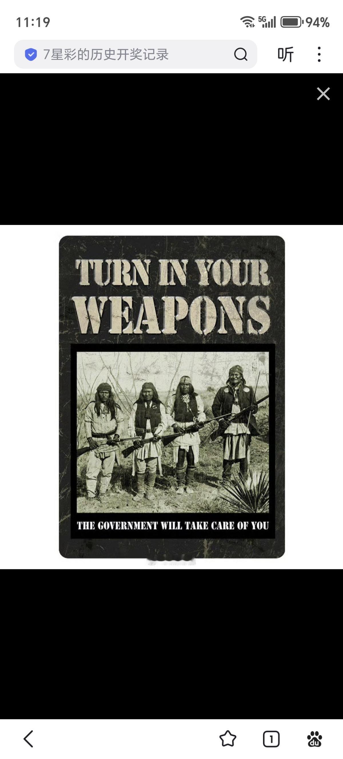 1890年12月29日,美国第七骑兵团对伤膝河附近的印第安人部落进行屠杀,300余名印第安人遇害。 美军也因印第安人的反抗,死伤50余人。 美国支持拥枪海报:“缴枪不杀,美国政府会好好关照你们的。”