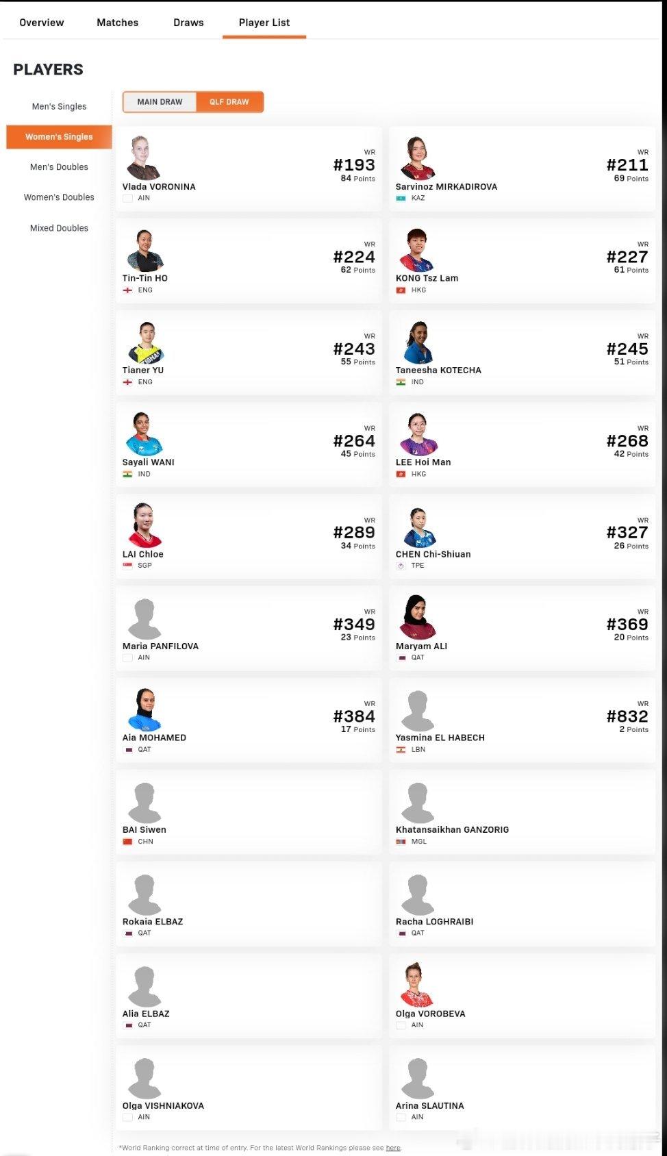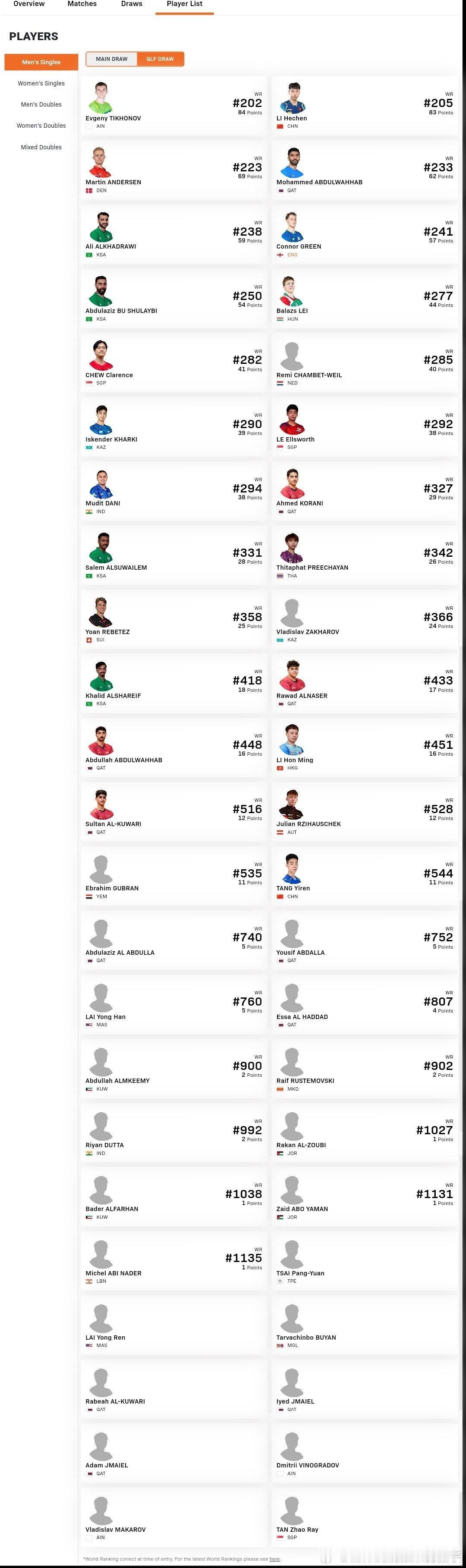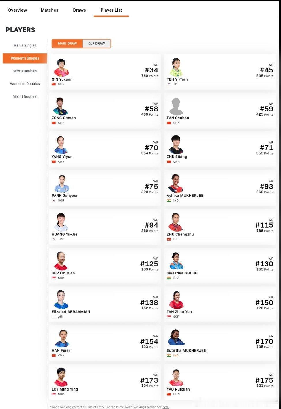 2026WTT多哈支线赛中国队单打报名:1月27日-31日男单正赛:陈俊菘、黄友政、温瑞博、徐瑛彬、袁励岑、徐海东男单资格赛:李和宸、唐乙仁女单正赛:覃予萱、纵歌曼、范姝涵、杨屹韵、朱思冰、韩菲儿、姚睿轩女单资格赛:白思文