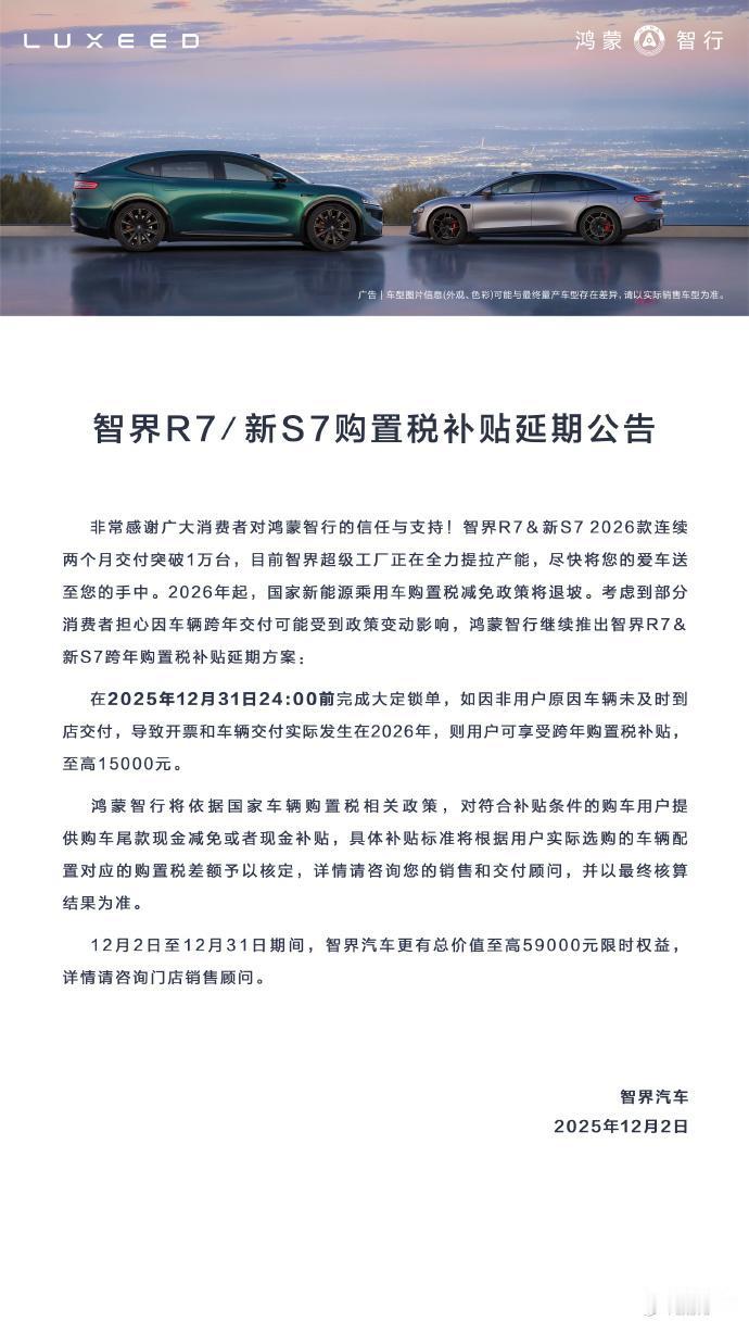 智界这波是真·杀疯了!🚗💨 12月交付量再次突破10000台!连续三个月稳坐“万台俱乐部”[给力] 更重要的是,智界R7&新S7的【跨年购置税补贴】延期了!12月31日24:00前完成大定锁单,就能享至高15000元兜底补贴!相当于国家减税福利直接给你续上,这波“年终冲刺福利”,智界是懂怎么拿捏消费者的![666] 智界S7 (中大型轿车): 售价:22.98-28.98万元 “0.203Cd超低风阻” 后驱版CLTC续航705km/855km,四驱版3.3秒破百+785km续航,15分钟超快充(30%-80%)。 智界R7 (中大型轿跑SUV): 售价:24.98-30.98万元 增程版综合续航1673km 纯电版最高802km CLTC续航,四驱版3.9秒破百。 两款车都全系标配华为ADS 4.0高阶智驾,鸿蒙座舱丝滑体验,还有空气悬架+CDC,这配置,同价位还有谁?![看]