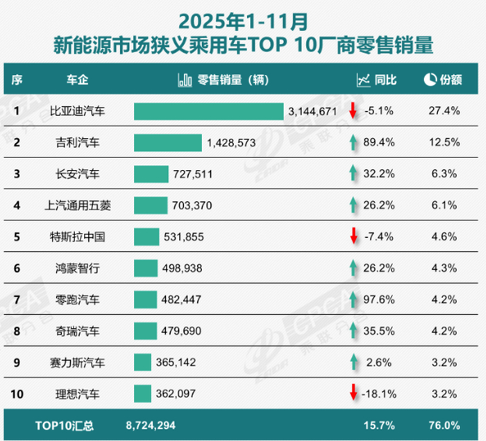 与此同时,小鹏汽车凭借智能技术突破,第三季度交付11.6万辆,同比增长149.3%,营收同比增长101.8%。零跑汽车以极致性价比在上个月实现75.1%的同比增长,11月交付7.03万辆,在低价市场形成冲击。蔚来汽车依靠NT3.0平台的新车稳住阵脚,进一步分割高端新能源市场份额。