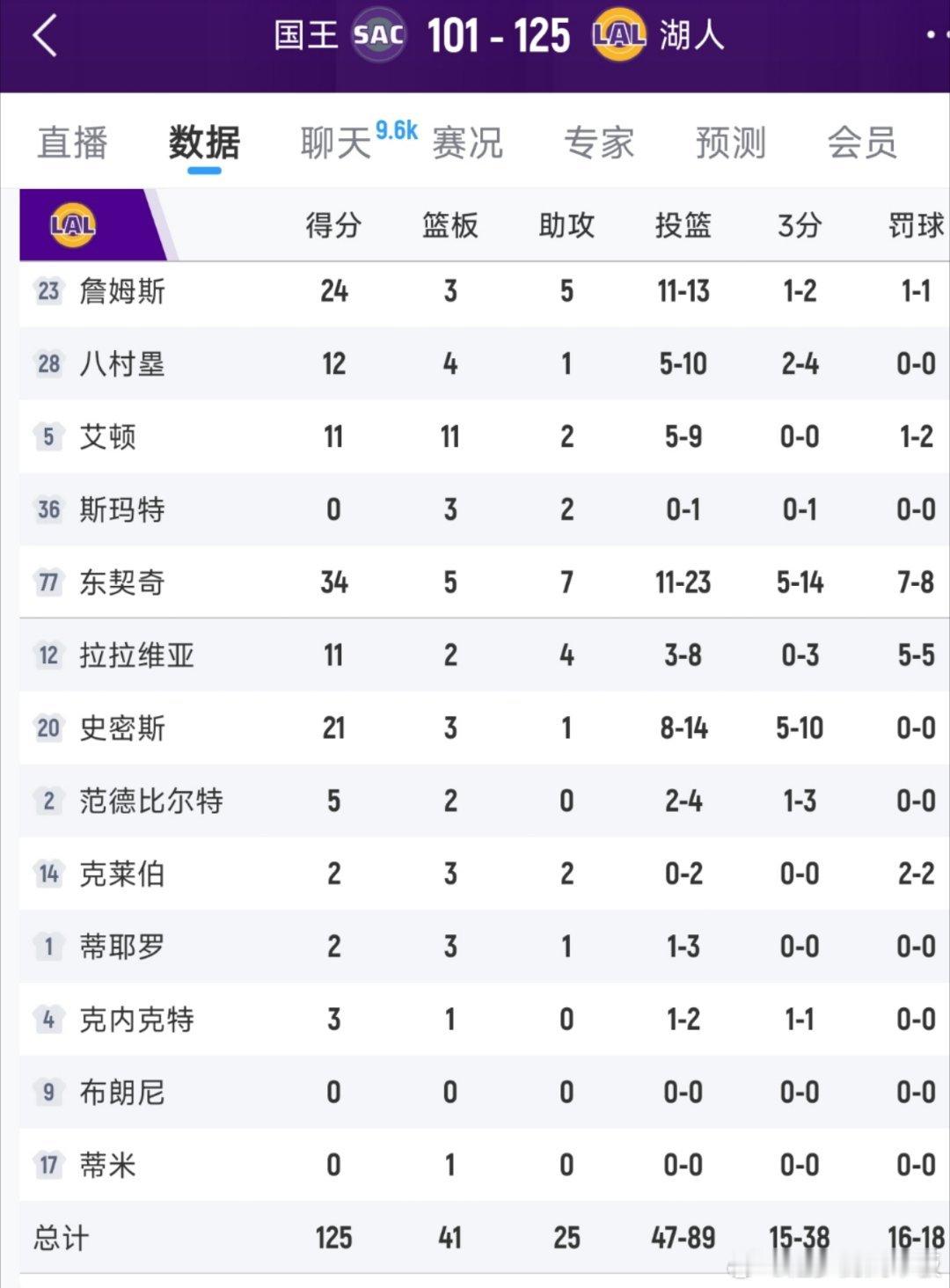 湖人主场125-101大胜国王,终结三连败!如何评价本场比赛东契奇34分5板7助3断,詹姆斯24分13中11,尼克-史密斯21分国王vs湖人