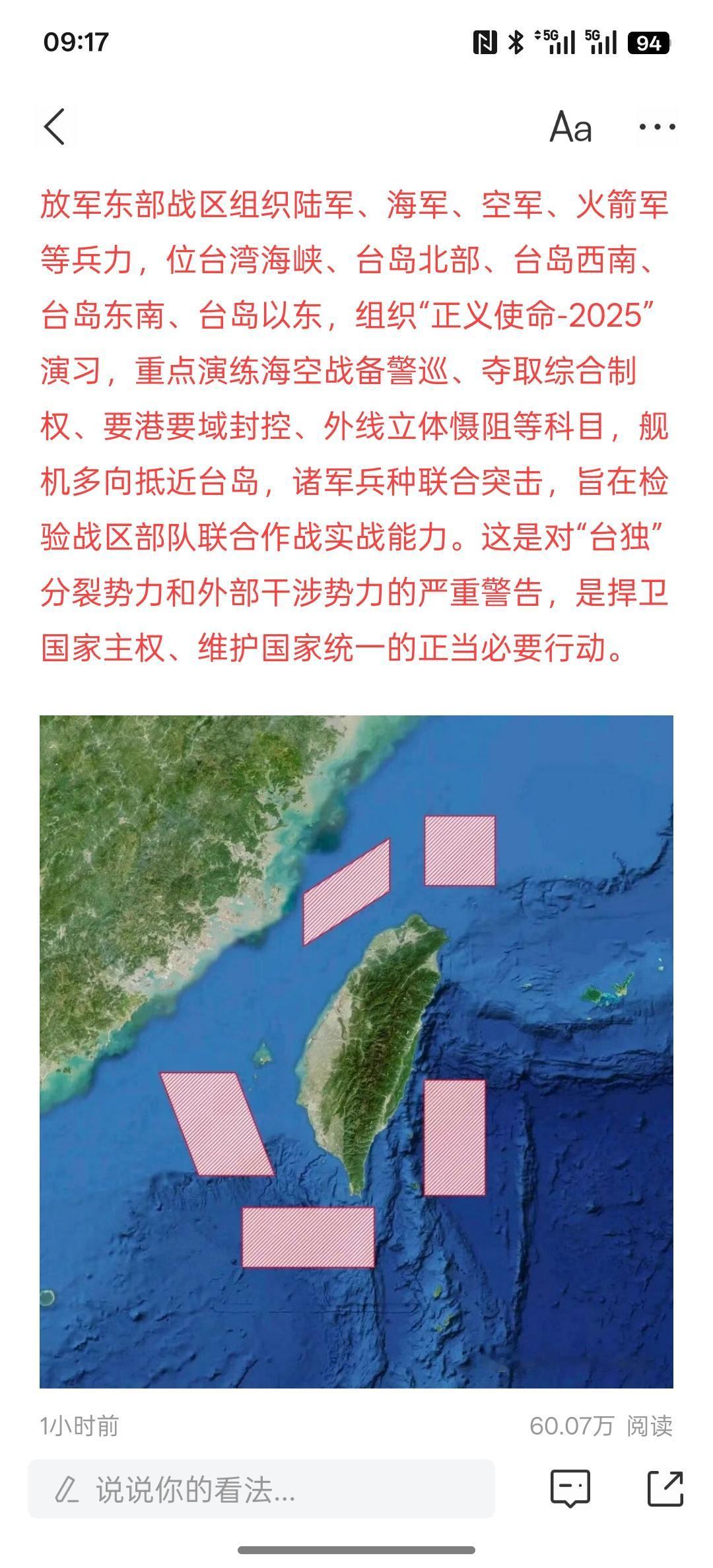 这是要围剿台独分子,这叫围而不打,但具有很强的威慑作用!只要台独分子敢公然挑衅,人民子弟兵随时都可能利剑出鞘! 东部战区又开展了正义使命2025演习,我们是正义之师!台独分子就是草寇! 这一次的演习就是要告诫那些外部势力,还有台独分裂势力,中国必将统一容不得谁干涉分裂祖国!这样的围城演习,一滴石油都进不了台湾岛内。台湾岛内能撑得了多久?哪怕就是用困斗兽的办法,台湾都撑不了半个月!断了台湾的能源供给,台独势力还拿什么嚣张?