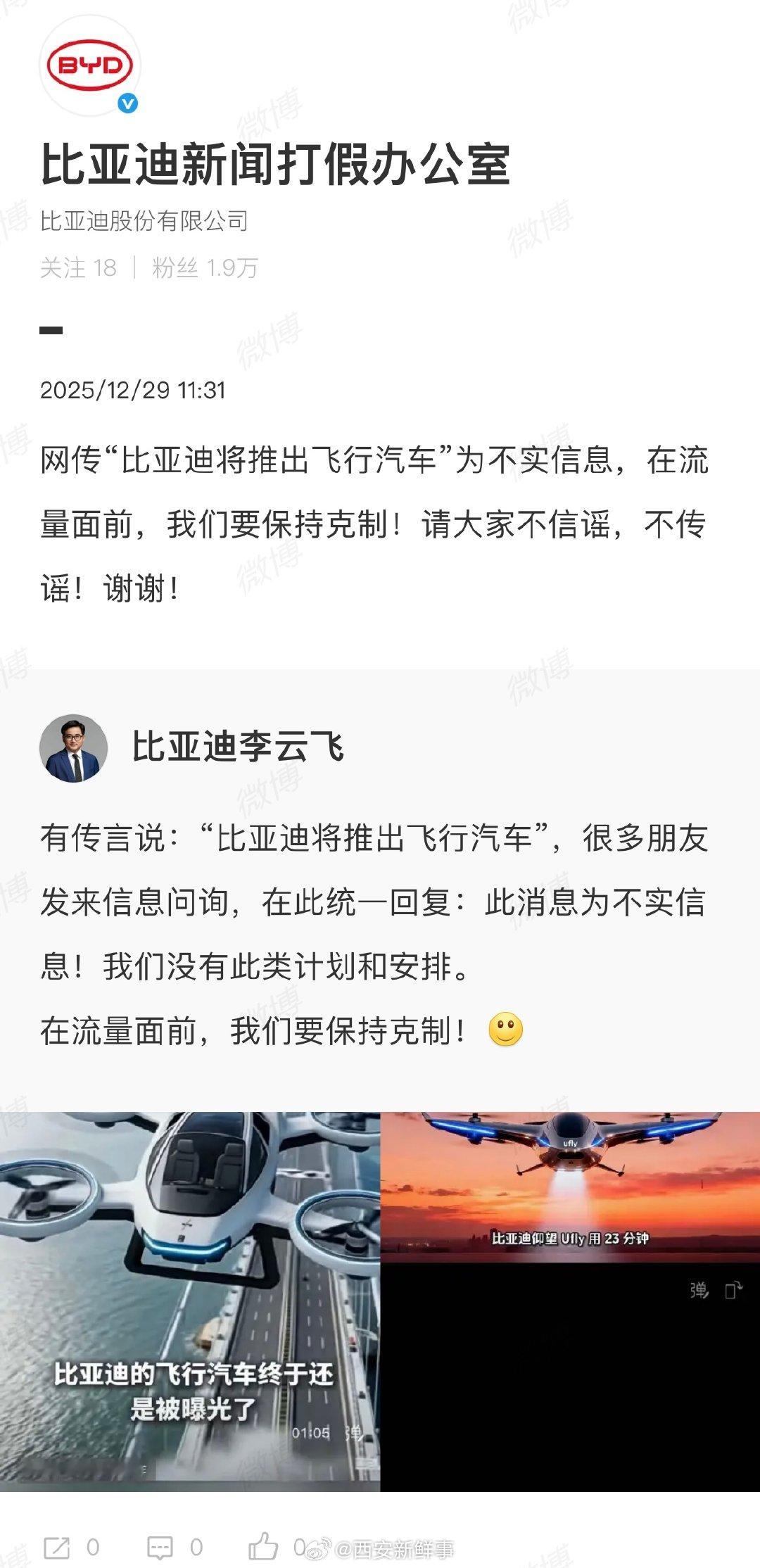 【比亚迪打假将推出飞行汽车】比亚迪再辟谣将推出飞行汽车12月29日,发文:有传言说:“比亚迪将推出飞行汽车”,很多朋友发来信息问询,在此统一回复:此消息为不实信息!我们没有此类计划和安排。在流量面前,我们要保持克制!随后,转发该条消息:网传“比亚迪将推出飞行汽车”为不实信息,在流量面前,我们要保持克制!请大家不信谣,不传谣!谢谢!