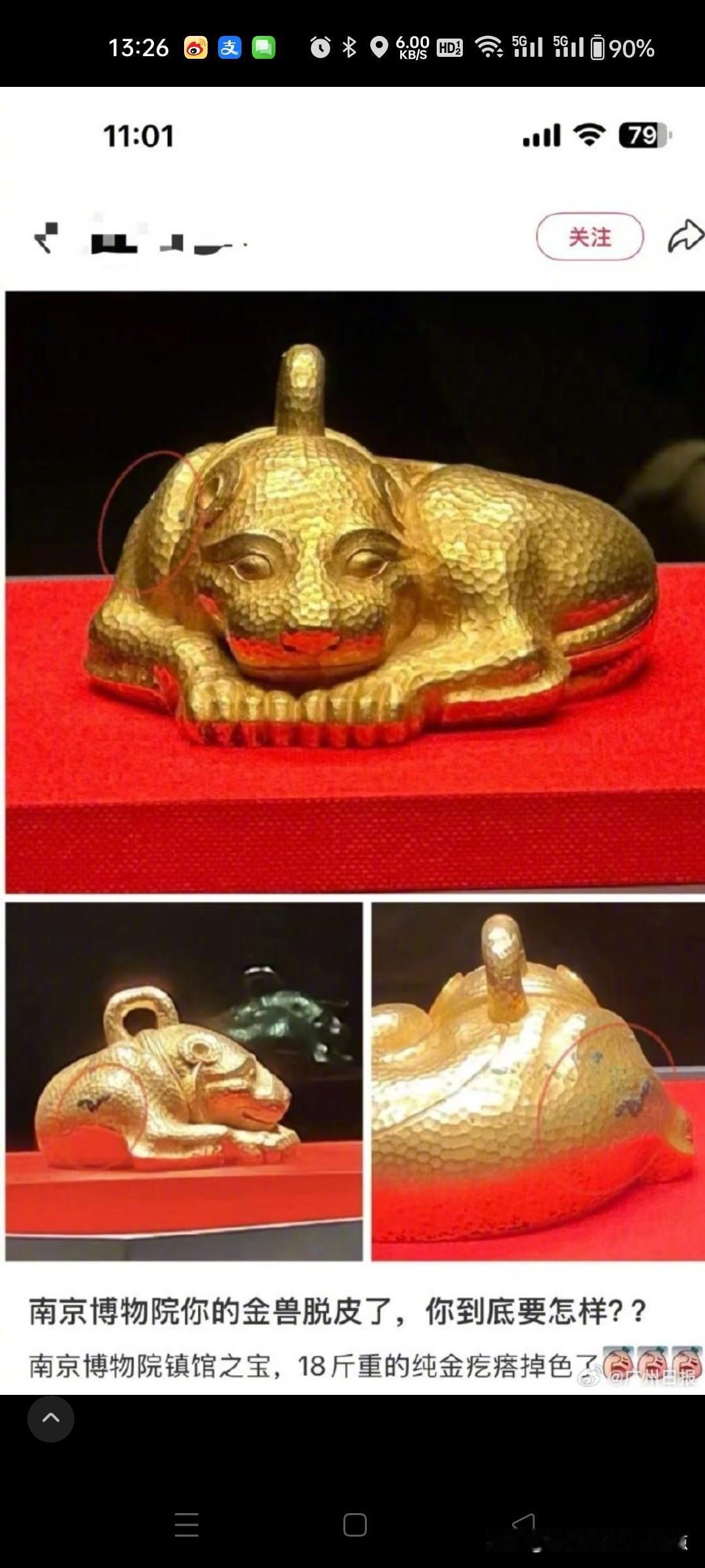 南博镇馆之宝西汉金兽表面出现黑斑与绿斑被网友质疑“脱皮掉色”,引发公众对文物状态的关注,院方回应称此为出土文物的正常现象。 1. 网友质疑焦点 表面痕迹:网传图片显示金兽右腿上方有一大块黑斑及零星绿色斑点,部分网友推测可能因氧化或保存不当导致“脱皮掉色”。 文物背景:金兽1982年出土于江苏盱眙,重9100克,含金量99%,是我国出土最重的古代黄金铸器,其珍贵性加剧了公众对异常痕迹的敏感。 2. 南京博物院回应核心 自然成因:院方明确表示黑斑与绿斑并非“掉色”,而是出土文物长期形成的包浆及自然磨损现象,属正常状态。 历史依据:金兽出土时颈部即残留铜锈绿斑,因其被发现时覆盖在铜壶上,并被另一铜器倒扣,铜锈痕迹为埋藏环境所致,已故原院长姚迁早年已对此释疑。 专业佐证:工作人员强调,金兽历经长期公开展示及众多专家考察,若存在异常“早已被质疑”。 3. 文物当前状态 未在展出:金兽此前陈列于“镇院之宝”展厅,因该展厅需定期轮换展品且近期关闭,短期内不会重新展出。 咨询渠道:公众如需进一步了解细节,可通过南京博物院官网留言板反馈。 4. 公众关注延伸 事件反映出公众对顶级文物保存状况的高度重视,而院方结合出土背景与科学认知的回应,为理解文物自然痕迹提供了专业视角。