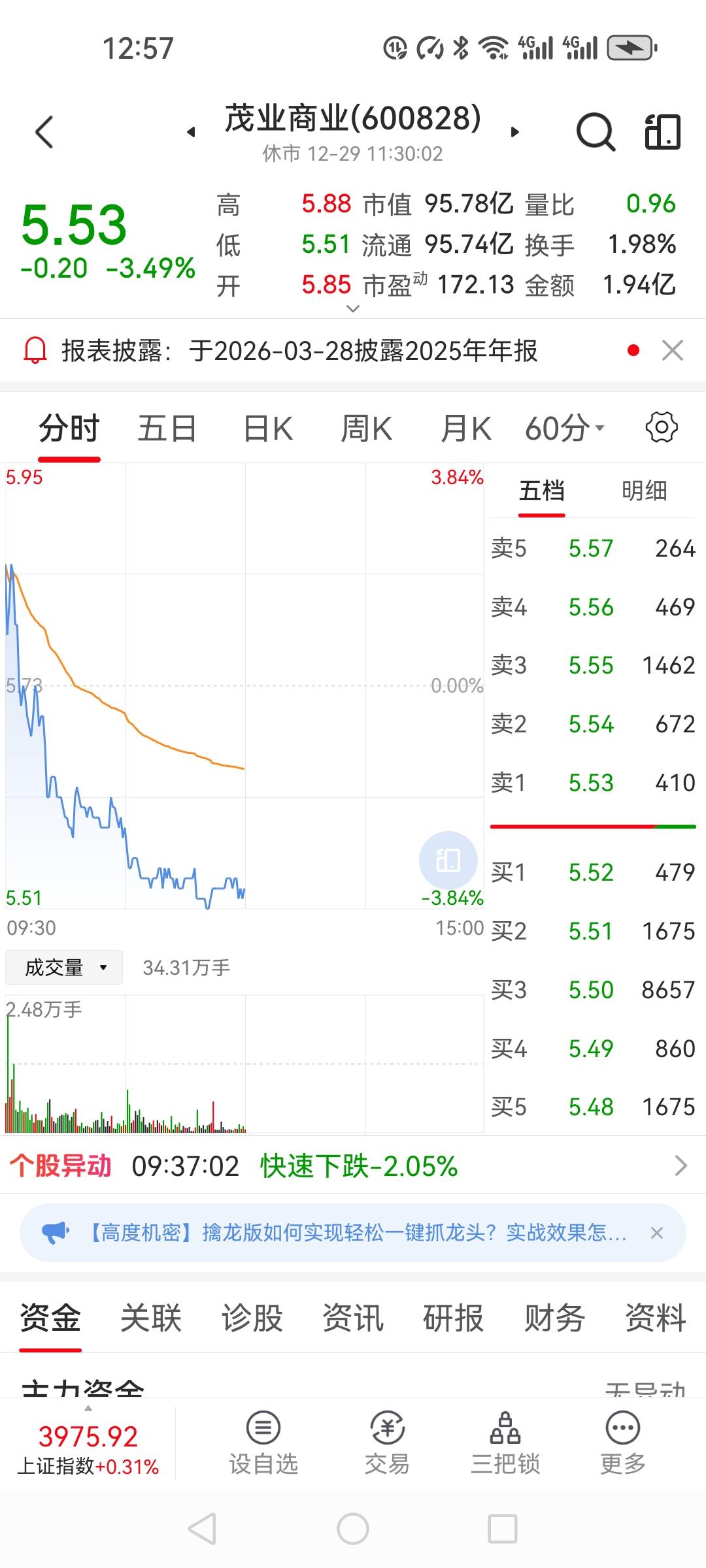上午一顿瞎操作,涨飞的股票没买却买了下跌的茂业商业。 航天电子和永鼎股份继续上涨,转头买了茂业商业,看到跌的差不多了,就在5.6把剩下的子弹,全部买了茂业商业,买入后又开始下滑,最低滑倒5.51,收在5.53,总亏6个多点。 本想做个波段,结果却变成了加仓,并且还加大了亏损,你说这股炒的。为什么不去买强势股,却买了别人推荐的票。 你们买过股评家推荐的票吗?谈谈你们的看法,接受教训,一起努力,一起加油!
