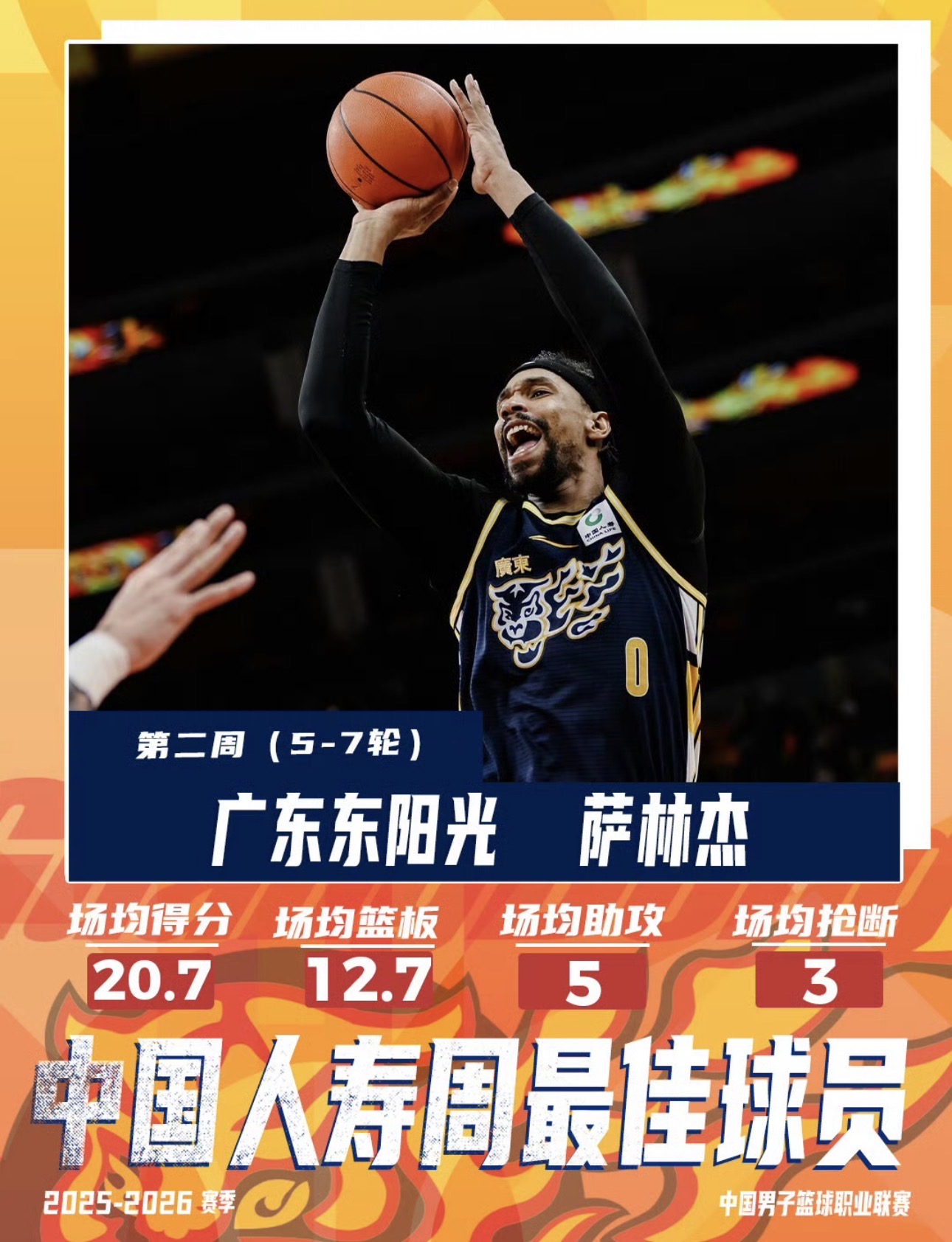 萨林杰本周出战3场比赛,率领广东宏远篮球俱乐部取得全胜,他在场均出场29分钟的时间里能够得到20.7分、12.7篮板、5助攻、3抢断的全面数据,3场比赛均取得两双数据且0失误。