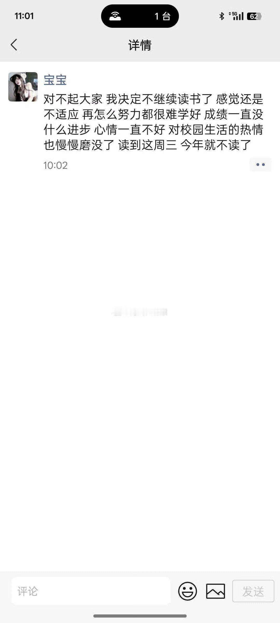 网红小不点杨清柠朋友圈发文声称因为心情不好,不再继续读书了。