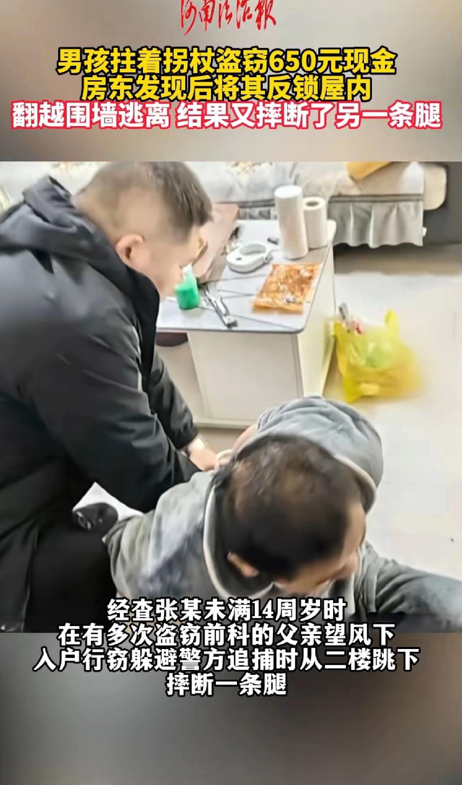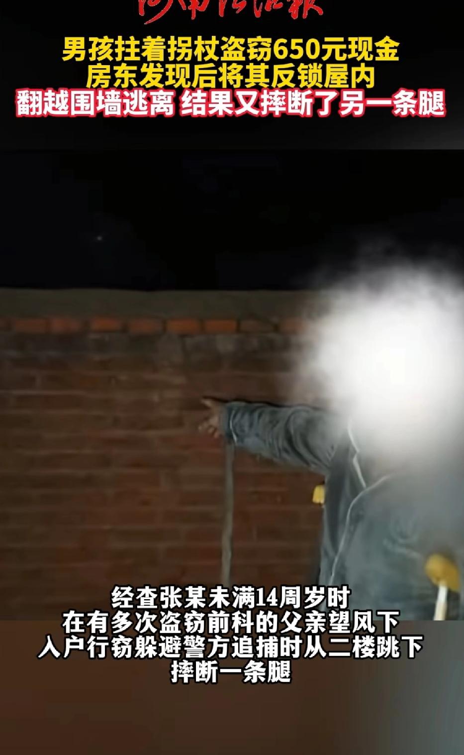 腿都断了还要行窃!这个黑龙江佳木斯的14 岁男孩,腿都断了还拄着拐杖盗窃 650 元现金,被房东发现后,关在院子里翻墙逃跑时,又摔断另一条好腿。 真是不怕死的蠢贼,照我说摔死了也是活该。 这爷俩一起作案,有过多次前科父亲负责望风,儿子负责行窃,这瘸着腿偷650元,逃跑时又摔断了另外一条腿。 还好只是摔断一条腿,要是摔死了,家人会不会跑去讹诈失主, 又该说道犯法了让法律管,不该反锁房租,逼其狗急跳墙,最后导致死亡,让失主赔偿之类的…… 碰到这种人该怎么办?又不能直接枪毙,父子俩都行窃,父亲有过多次前科,狗改不了吃屎,只能祸害群众。 爷俩整天偷鸡摸狗,看着吧!看病的钱从哪来?整天就想着不劳而获,这样的人在社会上只能祸害别人。 遇到这种人真是让人无语,身体都这样了还不踏实做人,偏要走歪路,最终也都被抓了,希望进去让工作人员好好改造,别在偷鸡摸狗了。