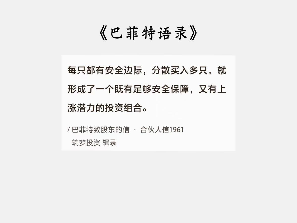 No.039 巴菲特谈投资的“分散与集中” 巴菲特曰:“每只都有安全边际,分散买入多只,就形成了一个既有足够安全保障,又有上涨潜力的投资组合。” 分散还是集中?单吊一支股还是三四个行业七八支个股?这是每个投资者都必须面对的课题。 分散投资的好处是降低风险,提高安全度,然而却会拉低收益率。而集中投资虽然能获得更多利润,但却提高了风险,降低了安全度。 在风险与收益中,如何做平衡? 我的投资原则是“不败而后求胜”。在保证安全性的基础上,尽可能地攫取最大化的收益。所以,无论是选股还是选策略,我首要考虑的是安全。 不过,在实际执行中,我会根据投资机会的大小、手头闲钱的多寡,做好仓位控制,平衡好风险与收益。既不太过分散,避免拉低太多收益率,也不过于集中,动摇投资系统的安全度。 分散与集中从不是一个固定比例,而是时时都处于动态调整中。它会随着市场环境、资金体量、机会大小、胜率等因素的改变而变化。