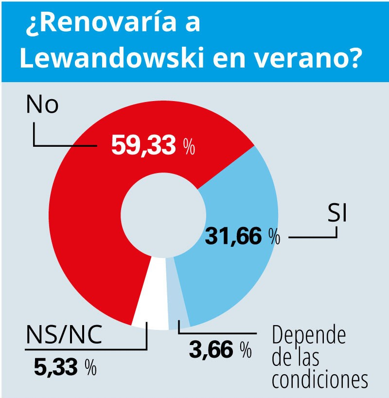 世体对300名俱乐部会员的调查: ❓莱万多夫斯基会在夏天续约吗? ❌否:59.33% ✅是:31.66%体育大赏巴萨至死不渝红蓝魂