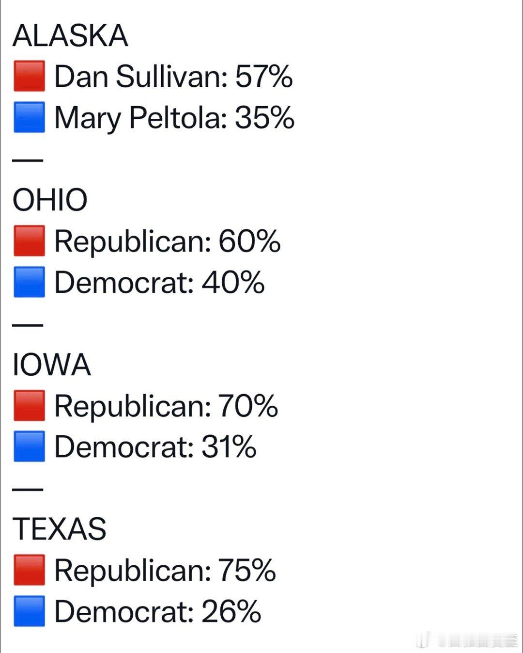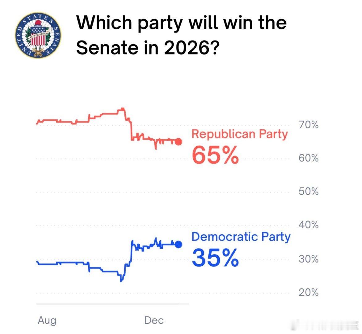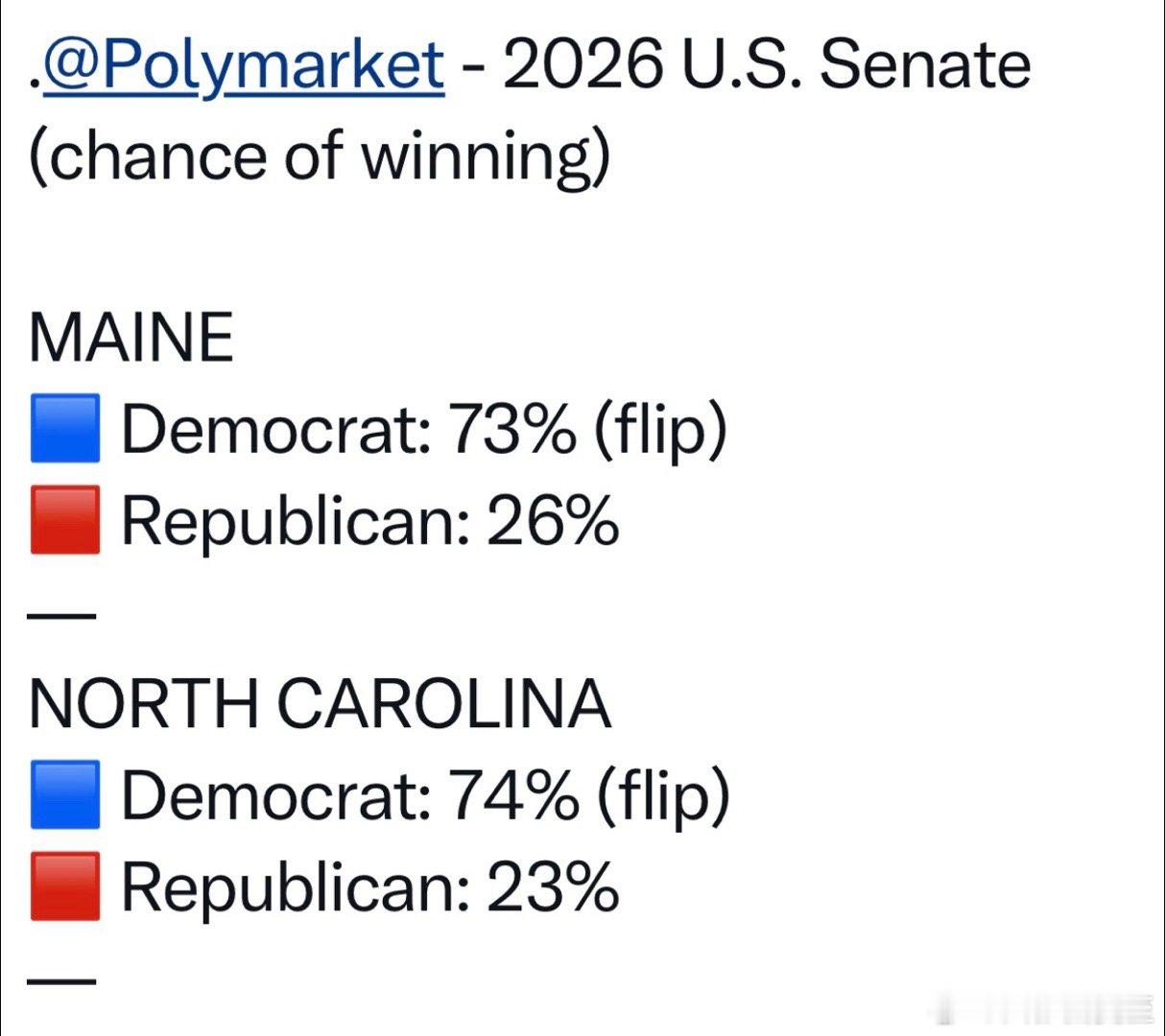 美国中期选举的市场预期:众议院多数:民主党(79%)参议院多数:共和党(65%)参议院具体预期:民主党翻蓝两席:缅因、北卡民主党保住:佐治亚、密歇根、新罕布什尔共和党保住:佛罗里达、内不拉斯加、阿拉斯加、俄亥俄、爱荷华、得克萨斯参议院现在53-47,如果预期准确,2027年是51-49,共和党最多可以丢一票(50-50➕副总统)