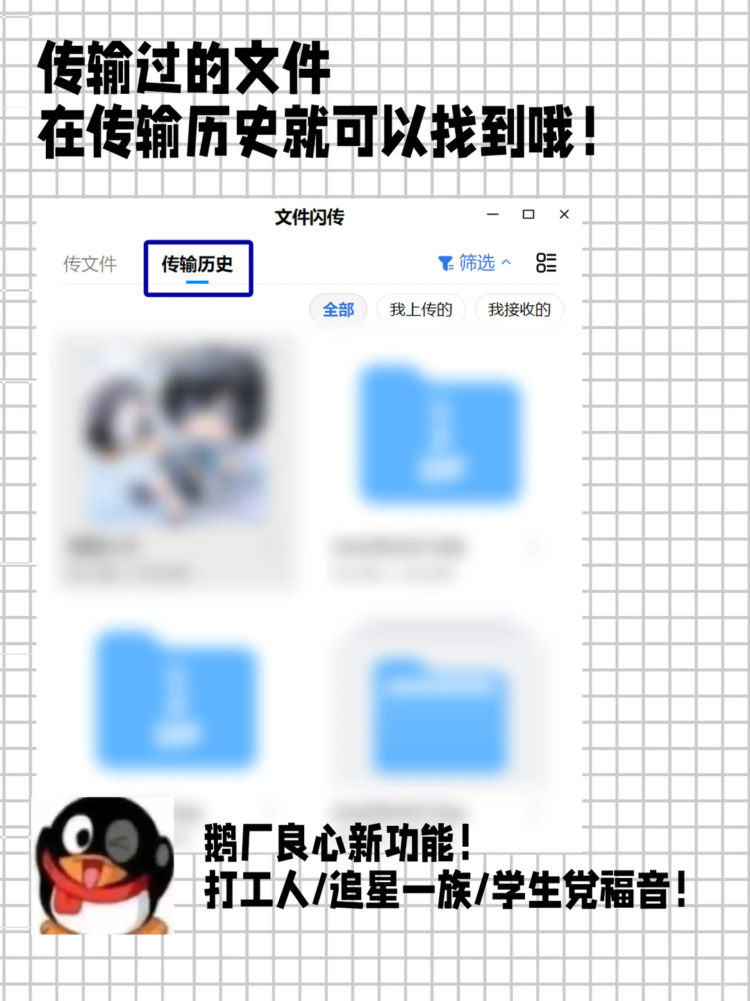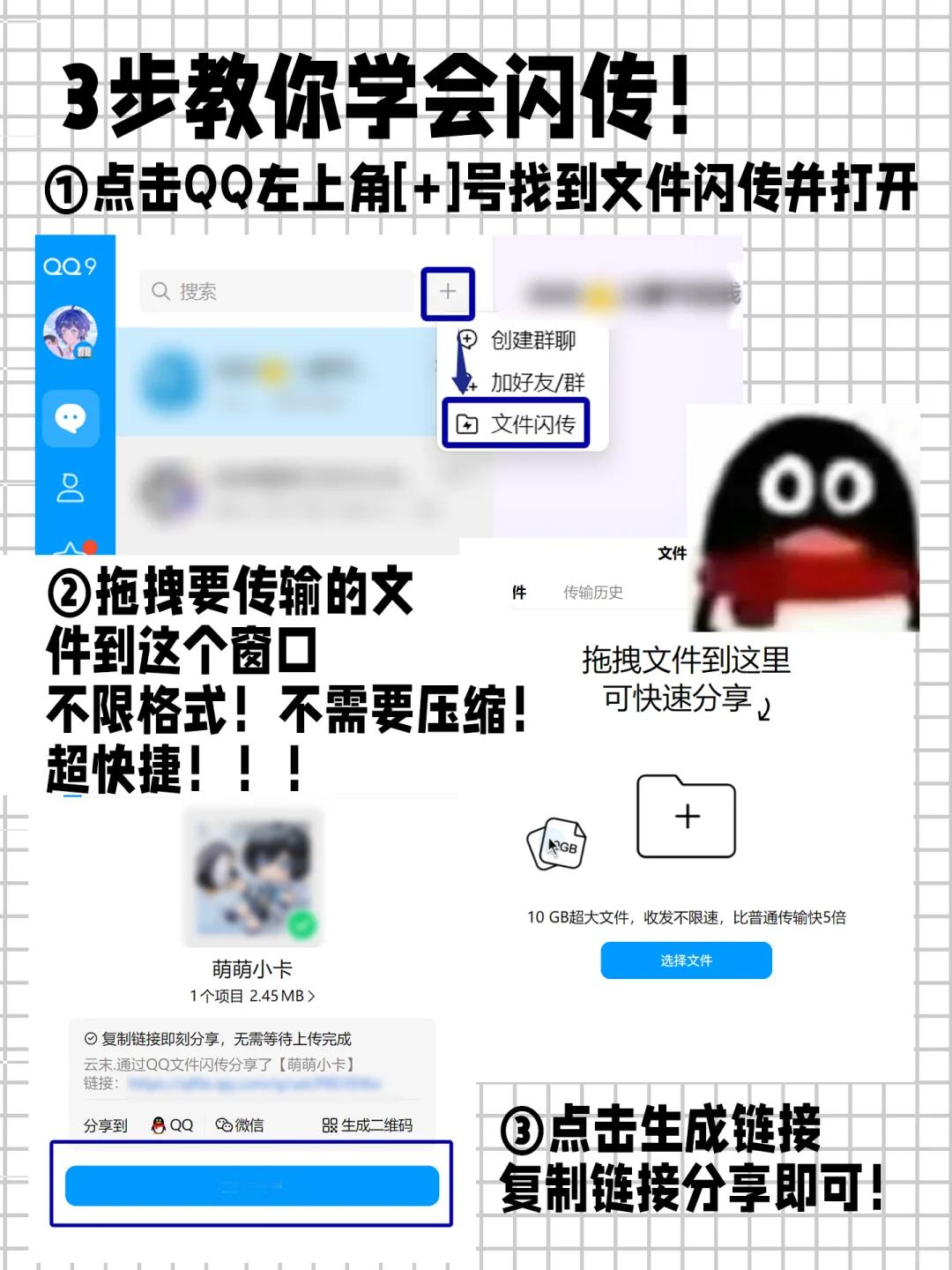 QQ你有这功能怎么不早说 鹅你藏得也太深了,原来用QQ闪传几百mb的文件几秒就传好了,跨平台还能分享链接,效率拉满了,之前白熬那么多等待的夜!顺便教你们3步学会用法超简单~