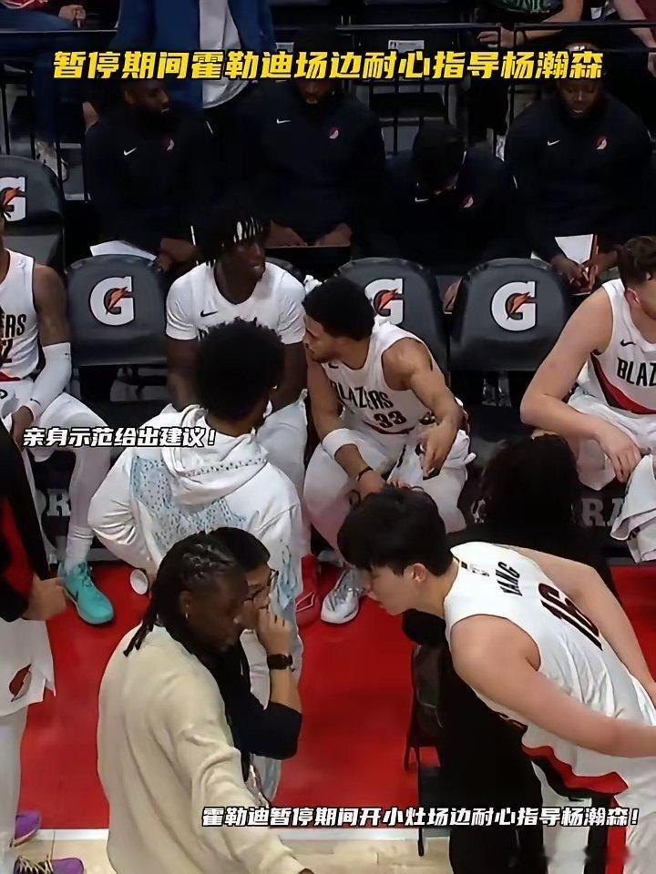 虚心学习不断进步!霍勒迪场边耐心指导杨瀚森暂停期间霍勒迪场边耐心指导杨潮森,亲身示范给出建议。杨瀚森如何站稳轮换