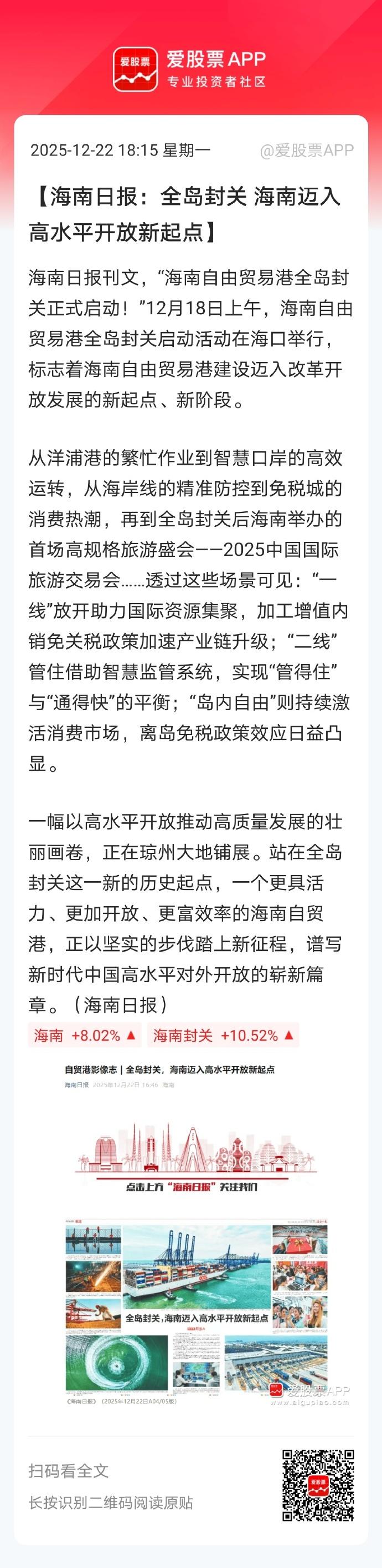今天老周期商业航天、海峡两岸开始走弱了。活跃资金跑到海南了,整个板块差点涨停,连中国中免都近2个板了! 这个有点新老切换的意思,但海南方向一向不持续,典型的渣男。今天这个涨停潮,主要是周末消息面发酵,量化资金抓取舆论语料,利用社会讨论度炒起来的。 所以明天要做两手打算,一是海南走弱的话,资金大概率还是回归主线商业航天、海峡两岸、大消费方向;二是海南如果继续强势,就是下一个福建了。 刀锋认为,海南板块要比福建板块更有逻辑性。一是特殊政策极其吸引力,可能不亚于当年深圳改革开放,;二是吸引消费回流是有戏的,以后买什么名牌包包、香水化妆品,黄金苹果手机啥的。真不用再去欧洲日韩,直接去海南吧,也算支持内需了! 海南封关后才爆发,我觉得跟高层多次喊要提振内需,市场开始认可消费逻辑有关。毕竟海南首先受益的就是免税,旅游、航空酒店这些服务性消费!资金选择海南+消费,相当于是打开了炒消费这个口子。
