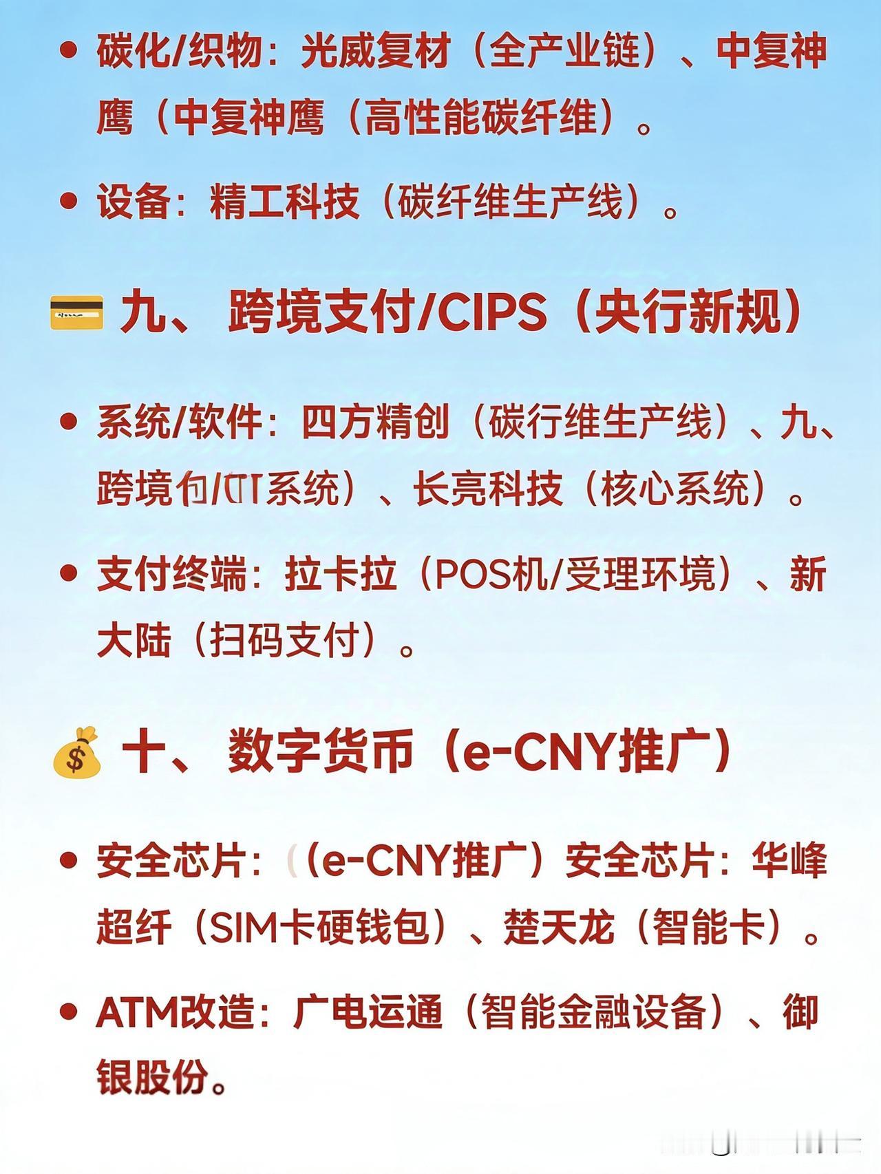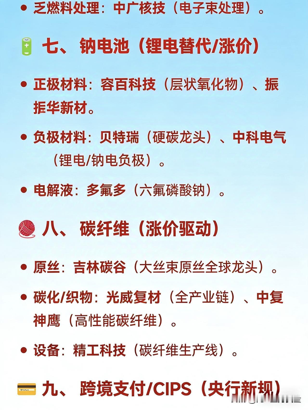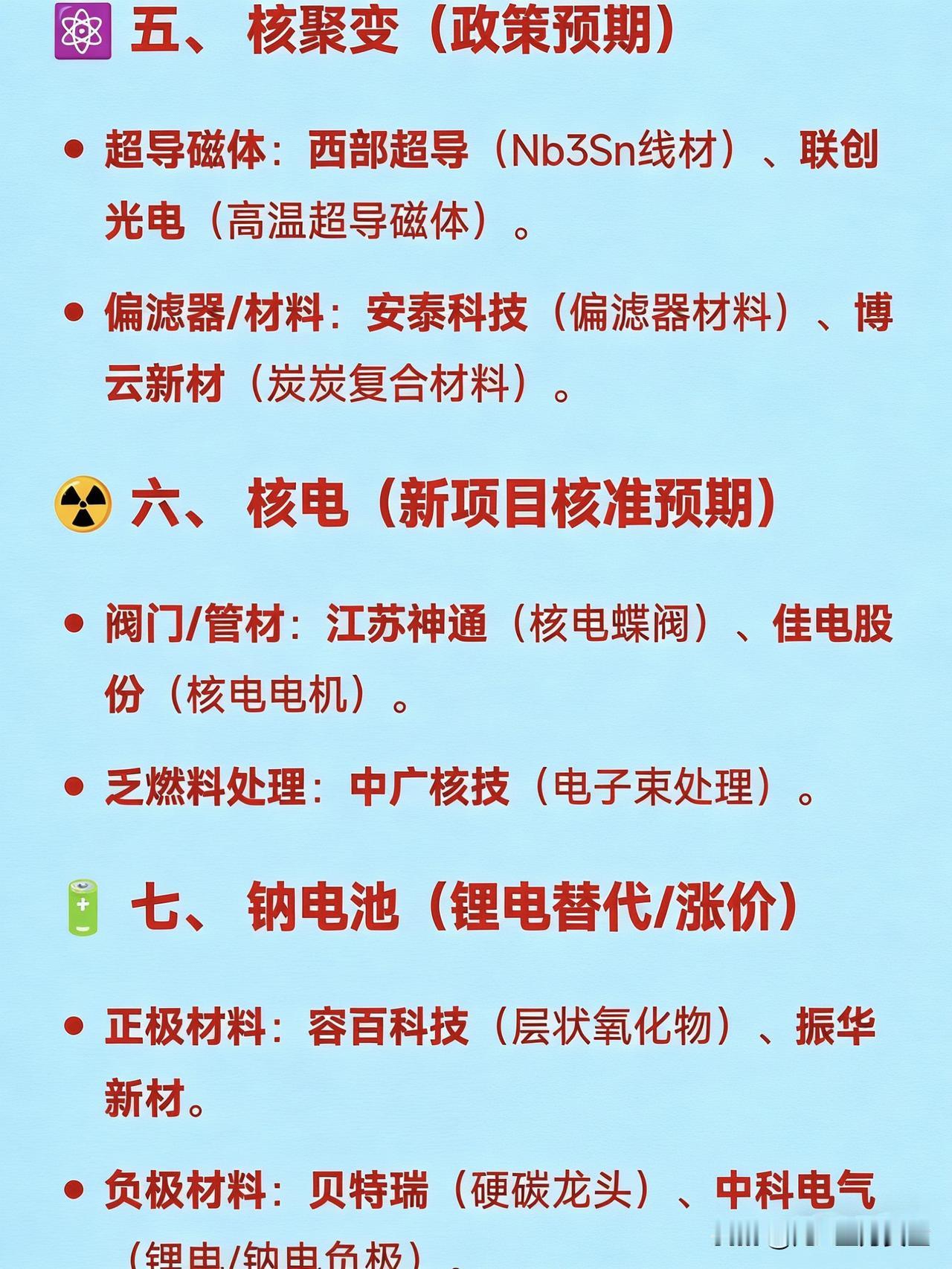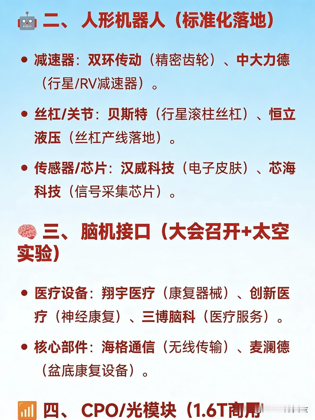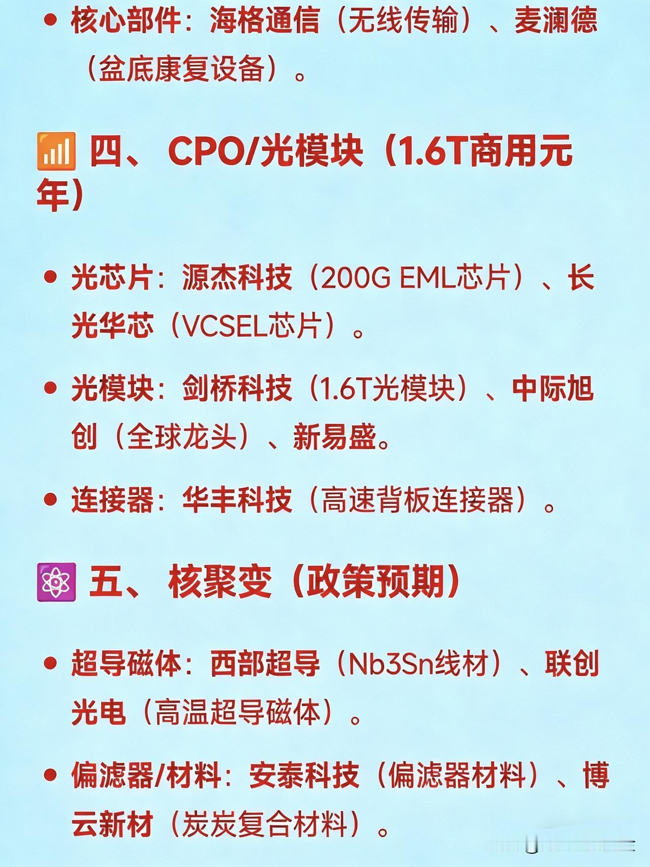 12月29日十大热点概念及产业链龙头梳理 🚀 一、 商业航天(政策+发射密集) 碳纤维材料:光威复材(军用碳纤维龙头)、中简科技(航天高端碳纤维)、吉林化纤(大丝束原丝)。 火箭制造/配套:航天发展(指控通信)、神剑股份(星箭结构件)、雷科防务(星载雷达)。 地面设备/卫星:海格通信(卫星导航)、中国卫星(小卫星制造)。 🤖 二、 人形机器人(标准化落地) 减速器:双环传动(精密齿轮)、中大力德(行星/RV减速器)。 丝杠/关节:贝斯特(行星滚柱丝杠)、恒立液压(丝杠产线落地)。 传感器/芯片:汉威科技(电子皮肤)、芯海科技(信号采集芯片)。 🧠 三、 脑机接口(大会召开+太空实验) 医疗设备:翔宇医疗(康复器械)、创新医疗(神经康复)、三博脑科(医疗服务)。 核心部件:海格通信(无线传输)、麦澜德(盆底康复设备)。 📶 四、 CPO/光模块(1.6T商用元年) 光芯片:源杰科技(200G EML芯片)、长光华芯(VCSEL芯片)。 光模块:剑桥科技(1.6T光模块)、中际旭创(全球龙头)、新易盛。 连接器:华丰科技(高速背板连接器)。 ⚛️ 五、 核聚变(政策预期) 超导磁体:西部超导(Nb3Sn线材)、联创光电(高温超导磁体)。 偏滤器/材料:安泰科技(偏滤器材料)、博云新材(炭炭复合材料)。 ☢️ 六、 核电(新项目核准预期) 阀门/管材:江苏神通(核电蝶阀)、佳电股份(核电电机)。 乏燃料处理:中广核技(电子束处理)。 🔋 七、 钠电池(锂电替代/涨价) 正极材料:容百科技(层状氧化物)、振华新材。 负极材料:贝特瑞(硬碳龙头)、中科电气(锂电/钠电负极)。 电解液:多氟多(六氟磷酸钠)。 🧶 八、 碳纤维(涨价驱动) 原丝:吉林碳谷(大丝束原丝全球龙头)。 碳化/织物:光威复材(全产业链)、中复神鹰(高性能碳纤维)。 设备:精工科技(碳纤维生产线)。 💳 九、 跨境支付/CIPS(央行新规) 系统/软件:四方精创(银行IT系统)、长亮科技(核心系统)。 支付终端:拉卡拉(POS机/受理环境)、新大陆(扫码支付)。 💰 十、 数字货币(e-CNY推广) 安全芯片:华峰超纤(SIM卡硬钱包)、楚天龙(智能卡)。 ATM改造:广电运通(智能金融设备)、御银股份。