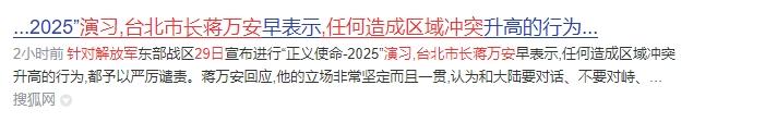 解放军围台军演 蒋万安叫嚣:予以严厉谴责,针对解放军29日展开围台演习,台北市长蒋万安也跳出来叫嚣,“任何造成区域冲突升高的行为都予以严厉谴责。”   就在台北市长蒋万安结束上海行程的第二天,中国人民解放军东部战区正式启动“正义使命-2025”联合演训行动。   这次行动覆盖台湾海峡及台岛北部、西南、东南、以东多个海空域,组织陆军、海军、空军、火箭军等多兵种力量,重点练兵海空战备警巡、综合制权夺取、要港要域封控以及外线立体慑阻等科目。   蒋万安12月28日在上海出席双城论坛时,还大谈“接触比抵触好,对话比对抗好,了解比误解好,互动比冲突好”,并强调“双城好,两岸一定好”。   他呼吁两岸走向和平繁荣,而不是对抗冲突,这种表态听起来冠冕堂皇,实际上回避了核心问题,两岸交流的前提是坚持一个中国原则和“九二共识”,反对“台独”。   大陆方面多次明确,任何政党、团体或人士,只要在这一政治基础上,就能加强交流、凝聚共识。   这前后态度转变之快,令人质疑其真实意图,他一边享受大陆城市交流带来的实惠,一边回岛内迎合某些势力,攻击大陆维护统一的正当行动。   这种骑墙态度,不仅无助于两岸关系改善,反而助长岛内分裂势头的嚣张。   美国12月17日宣布的创纪录111亿美元对台军售案,这笔军售包括海马斯火箭系统、反坦克导弹、反装甲无人机等进攻性武器,明显强化台湾所谓“不对称作战”能力,意图构建纵深打击体系。   大陆外交部已强烈谴责,并对相关美国军工企业实施反制,解放军东部战区发言人明确指出,这次行动正是对外部势力干涉和“台独”挑衅的有力回应。   蒋万安作为国民党籍市长,本应继承国民党传统,认同“九二共识”,推动两岸和平交流,可他的表现却让人失望。   他反对“一国两制”,却又不愿明确反对“台独”;他参加双城论坛获取市政经验,却在军演面前立刻站队谴责。   这种机会主义,不仅背离国民党主流民意,也辜负了蒋家历史传承。   蒋经国当年坚定反“独”促统,维护国家统一,可如今其曾孙却在两岸关键时刻摇摆不定,迎合岛内某些反中声音,实质上是在为“台独”势力撑腰。   个人认为,蒋万安这种前后不一的态度,暴露了国民党部分人士的软弱和短视,如果国民党想重振,不能再靠这种平衡术,而应旗帜鲜明反对“台独”、认同统一大势。   只有这样,才能真正为台湾民众谋福祉,为两岸和平贡献力量,否则,像蒋万安这样,一边吃交流红利,一边骂维护统一行动,只会让自己陷入尴尬,失去两岸同胞信任。   信息来源:搜狐网