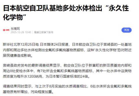 快报!快报 日本突然宣布了   12月25日,日本航空自卫队新田原基地被曝出大问题。基地里面和周围取了8处水样检测,结果7处都超标了。超的是全氟和多氟烷基物质,就是那种很难分解的“永久化学品”。   这7处超标的水样中,有一处浓度达到了每升1200纳克,足足是日本暂行国家标准的24倍。更要命的是,和今年8月做的上一轮检测比起来,有6处水样里这类物质的含量还在往上走,污染范围没控制住不说,程度反倒越来越严重了。   可能有人不清楚这玩意儿的危害有多实在,不是简单的水质变差喝着有怪味那么简单。相关专家早就明确过,长期大量饮用被这类物质污染的水,不仅会影响生殖健康和儿童正常生长发育,严重时还可能诱发乳腺癌、前列腺癌等恶性疾病,对身体的伤害是不可逆的。   新田原基地的污染丑闻也不是孤例,往前倒推两年多,从2023年开始日本就没断过类似爆料。冲绳县、大阪府还有东京都,先后都查出过水体里这类“永久化学品”超标,周边不少居民去做血检,结果都出现了异常指标。有意思的是,这些出问题的区域,大多都挨着驻日美军基地或者日本自卫队基地,这些军事设施自然成了最大的污染源怀疑对象。   就说东京都的横田基地,早从2010年到2023年这十几年里,就至少发生过7起含这类物质的污水泄漏事件,可美军那边每次都矢口否认,把责任推得一干二净。直到去年10月,美军自己才松口,承认基地蓄水池里的污染污水,可能在8月暴雨期间流到了基地外面,这事儿当时气得东京都政府直接公开表达不满。   这边日本自卫队基地的污染刚曝光,那边冲绳县的居民还在为美军基地的污染问题奔波。冲绳县从2016年开始,先后四次申请进入美军基地调查污染源,每次都通过日本防卫省层层传达,却始终得不到回应。直到今年12月19日,美军才正式给出答复,就俩字:拒绝。   美军给出的理由也挺牵强,一会儿说没有科学依据证明基地是污染源,一会儿又扯日美两国对污染超标的判定标准不一样,横竖就是不让查。可冲绳县的环境专家早就拿出了明确结论,美军基地大概率就是污染源头,现在只能硬着头皮继续跟美方交涉,争取调查权限。   反观宫崎县政府,目前也只能做到要求新田原基地配合调查污染原因,同时对已查明的污染水体每季度做一次检测。可这种治标不治本的办法,根本拦不住污染扩散的脚步。   京都大学之前做过一项研究,从日本各地选了34家污水处理厂,结果在所有厂的污泥里都检出了这类物质,这意味着污染可能已经悄悄扩散到了日本全国,渗透到了日常生活的方方面面。   一边是军事基地要维持正常运转,一边是周边居民的健康安全受到威胁,日本政府夹在中间显得格外被动。美军基地不让查,自卫队基地的污染原因还没头绪,居民们只能眼睁睁看着身边的水源被污染,血检指标异常却找不到彻底解决的办法。说到底,这事儿最后受伤的还是普通老百姓,毕竟谁也不想天天担心喝的水、用的水里面藏着看不见的健康隐患,而这种担忧,短期内恐怕还没法彻底消除。