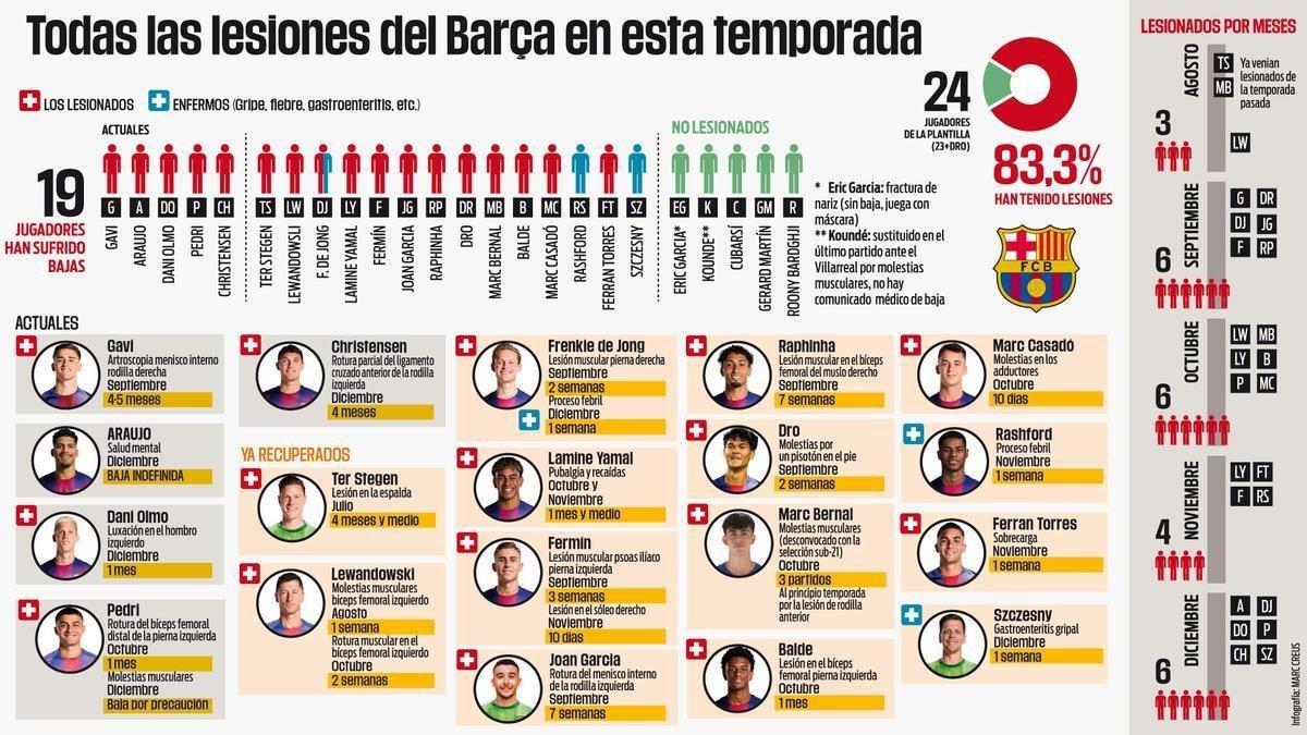 每体:巴塞罗那遭遇伤病危机……◾️本赛季球队共有 19 名不同的球员受伤,共计 23 次。 ◾️一线队只有五名球员没有因伤缺席:埃里克·加西亚、孔德、库巴西、杰拉德-马丁、鲁尼·巴尔德吉。巴萨体育大赏至死不渝红蓝魂